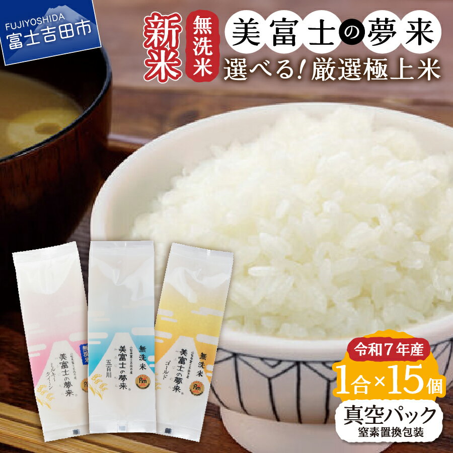 【 ふるさと納税 】簡単便利!無洗米 計量いらず小分け1合150g!とがずに炊飯!【ふるさと納税】 新米 米 令和7年産 無洗米 1合 × 15個 セット 真空パック 長期保存 『美富士の夢来』 選べる3品種 ゴールド ミルキークイーン 五百川 コメ 小分け 150g×15個 パック 個包装 防災 簡単 便利 アウトドア キャンプ 山梨 富士吉田