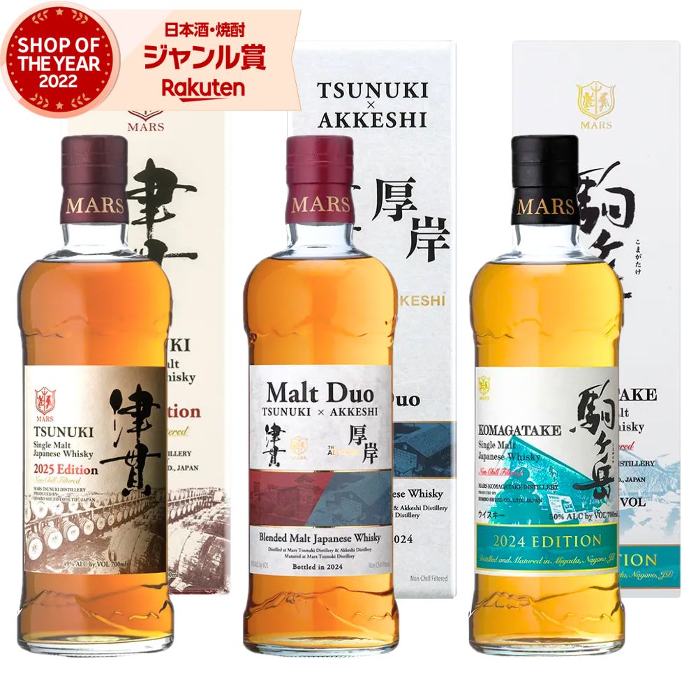 "本日"(10月25日)は 楽天カードご利用で【ポイント4倍】 ▽エントリーはコチラ▽ 【楽天 お買い物マラソン】 10/24(金)20:00~10/27(月)09:59 期間中当店ポイント3倍~ 買い回りでポイントUP! ▽エントリーはコチラ▽ 製品仕様 商品名 モルトデュオ津貫×厚岸、津貫2025、駒ヶ岳2024 本坊酒造 限定販売 名称 ウィスキー 内容量 ウィスキー 50度 700ml×3本 販売者 有限会社三浦屋 商品説明 「モルトデュオ津貫×厚岸 50度」 2016年、鹿児島と北海道それぞれの地で蒸留を開始したマルス津貫蒸溜所と厚岸蒸溜所。 気候風土が全く異なるこの二つの蒸溜所は、2018年に互いのモルト原酒を交換し、それぞれの地で熟成を始めました。 このボトルは、マルス津貫蒸溜所で熟成させた「津貫」「厚岸」二つのモルト原酒をヴァッティングしたブレンデッドモルトジャパニーズウイスキーです。 同時期に遠く離れた地でポットスチルに火を灯した、津貫と厚岸の協演をどうぞお楽しみください。 「シングルモルト津貫 49度」 盆地特有の寒暖差のある気候と蔵多山山系の良質な湧水に恵まれた、薩摩半島南西の緑あふれる山あいに位置するマルス津貫蒸留所。 「2024エディション」は、バーボンバレルやシェリーカスクで熟成したモルト原酒をヴァッティングした2024年リリースのジャパニーズシングルモルトウイスキーです。 やわらかく広がる甘く芳醇な香りとコク深く厚みのある味わいをお楽しみください。 「シングルモルト駒ヶ岳 50度」 良質な水と豊かな自然に囲まれた中央アルプス山系駒ヶ岳の麓に位置するマルス駒ヶ岳蒸溜所。 「2024エディション」は、バーボンバレルで熟成した原酒をベースに個性豊かなシェリーカスク、ワインカスク原酒をはじめとした様々な原酒をヴァッティングした2024年限定瓶詰のシングルモルトウイスキーです。 ※北海道、東北地方へのお届けは別途500円掛かります。 当店 酒舗三浦屋について 当店は芋焼酎の本場 鹿児島県出水市に実店舗を構える焼酎の専門店で御座います。 鹿児島県は薩摩半島と大隅半島からなる本土最南端の県です。 鹿児島県下の100蔵以上の焼酎を取り扱っております。 芋焼酎の飲み比べセットに関しても、当店のきき酒師、焼酎利酒師、ソムリエがセレクトしたこだわりの芋焼酎で御座います。 ロック、水割り、お湯割り、炭酸割り等 飲み方に合わせて、人気の焼酎をおすすめさせて頂きます。 家飲み、宅飲みなどの日常使いから、ギフトにもおすすめな焼酎セットもご紹介させて頂いております。 有名無名にかかわらず、プレミア焼酎や高級でなくても素晴らしい焼酎が沢山御座います。 まだ出会ったことのない、焼酎を紹介していきたいと思っております。 自家用はもちろんのこと当店のギフトセットは、ちょっとしたプチギフトから、内祝、父の日、母の日、敬老の日といった身近な方へのお礼やお祝いの気持ちを伝える、ギフトのご対応させて頂いております。 また、お中元や、お歳暮等 仕事関係の贈り物の焼酎も大変ご好評頂いております。 当店はデザイナーも常駐しており名入れギフトも多くご注文を頂いております。 お酒のギフトなら三浦屋と言って頂けるよう日々勉強しております。 お酒の中でも芋焼酎は、その日の気分や体調に合わせて、飲み方を変えられるところが御座います。 ロック、水割り、お湯割り、ソーダ割りにして焼酎ハイボールや、更にはアレンジした焼酎カクテル等もご好評です。 熱い夏には炭酸で割った焼酎ハイボールもおすすめです。 実は焼酎はアルコール度数の割りに、他のお酒に比べてカロリーも低く、さらに糖質は0で健康志向の方にも人気でおすすめです。 メッセージカード無料、メッセージカードフリーメッセージ可能 ☆楽天ショップオブザイヤー受賞☆ 2022年の年間ベストショップに選ばれました! ☆楽天ショップオブザマンス受賞☆ 日頃のご愛顧 感謝致します。 ▽このような用途にも利用されております▽ 誕生日祝い 父の日 父の日ギフト 父の日プレゼント 母の日 母の日ギフト 母の日プレゼント 敬老の日 おすすめ 20代 30代 40代 50代 60代 70代 80代 90代 お歳暮 御歳暮 お中元 御中元 お年賀 御年賀 暑中見舞い 残暑見舞い 内祝 内祝い お祝い返し 引き出物 引出物 結婚引き出物 結婚引出物 結婚内祝い 出産内祝い 命名内祝い 就職内祝い 新築内祝い 引越し内祝い 快気内祝い 開店内祝い お祝い 御祝 結婚式 結婚祝い 出産祝い 成人式 就職祝 昇進祝い 新築祝 上棟祝 開店祝い 退職祝 快気祝 全快祝 還暦祝 古稀祝 喜寿祝 傘寿祝 米寿祝 卒寿祝 白寿祝 金婚式 銀婚式 ダイヤモンド婚式 結婚記念日 三浦屋ギフト ギフトセット プレゼント 詰め合わせ 贈答 贈答品 お返し お礼 御礼 プレゼント お見舞い お見舞御礼 引越し 引越しご挨拶 記念日 記念品 定年退職記念品 ゴルフコンペ コンペ景品 賞品 香典返し 志 弔事 会葬御礼 法要 法要引き出物 法要引出物 法事 法事引出物 一周忌 三回忌 回忌法要 偲び草 初盆 供物 お供え 年始挨拶 季節のご挨