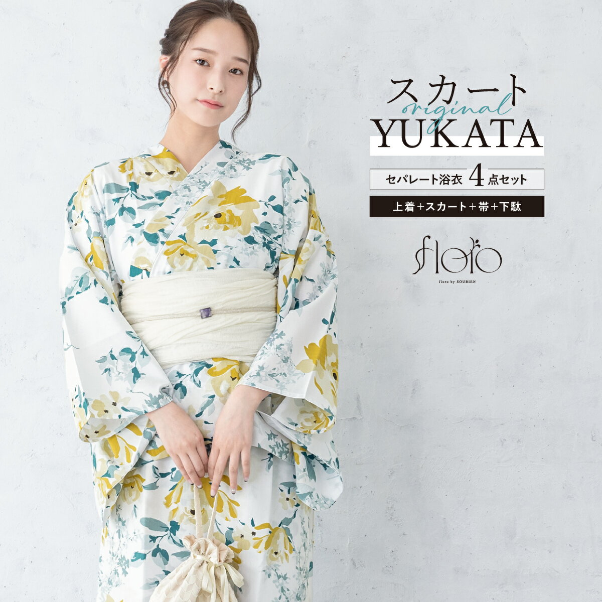 誰でも簡単キレイに決まる! 初心者 安心 着付け yukata ゆかた ユカタ スカート 上品 吸水速乾 人気 女性 綺麗 フェミニン 和装 10代 20代 30代 40代 women 夏着物 レトロ 柄【クリアランス30%offクーポン】10/12~21 浴衣 セット レディース floro 二部式浴衣 セパレート スカート 浴衣セット 兵児帯 2way 大人 3点セット 簡単 悩まない 涼しい コーディネート済み モダン 黄色 白 紫 花柄 おしゃれ 可愛い フリー 送料無料