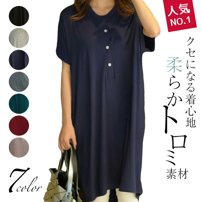 トロミのあるサラリとした肌触りが夏に心地良いゆったりロング丈&前開きなので授乳服やマタニティのトップスとしても◎ロング丈 Tシャツワンピース ロングTシャツ パジャマ【メール便で送料無料】【レビューを書いて10%OFFクーポンGET】トップス Tシャツ マタニティ 授乳服 ワンピース チュニック パジャマ ロング ロング丈 ロンT 前開き 膝丈 薄手 涼しい 冷感 とろみ カットソー ストレッチ ゆったり 大きいサイズ 半袖 春 夏 夏用 レディース