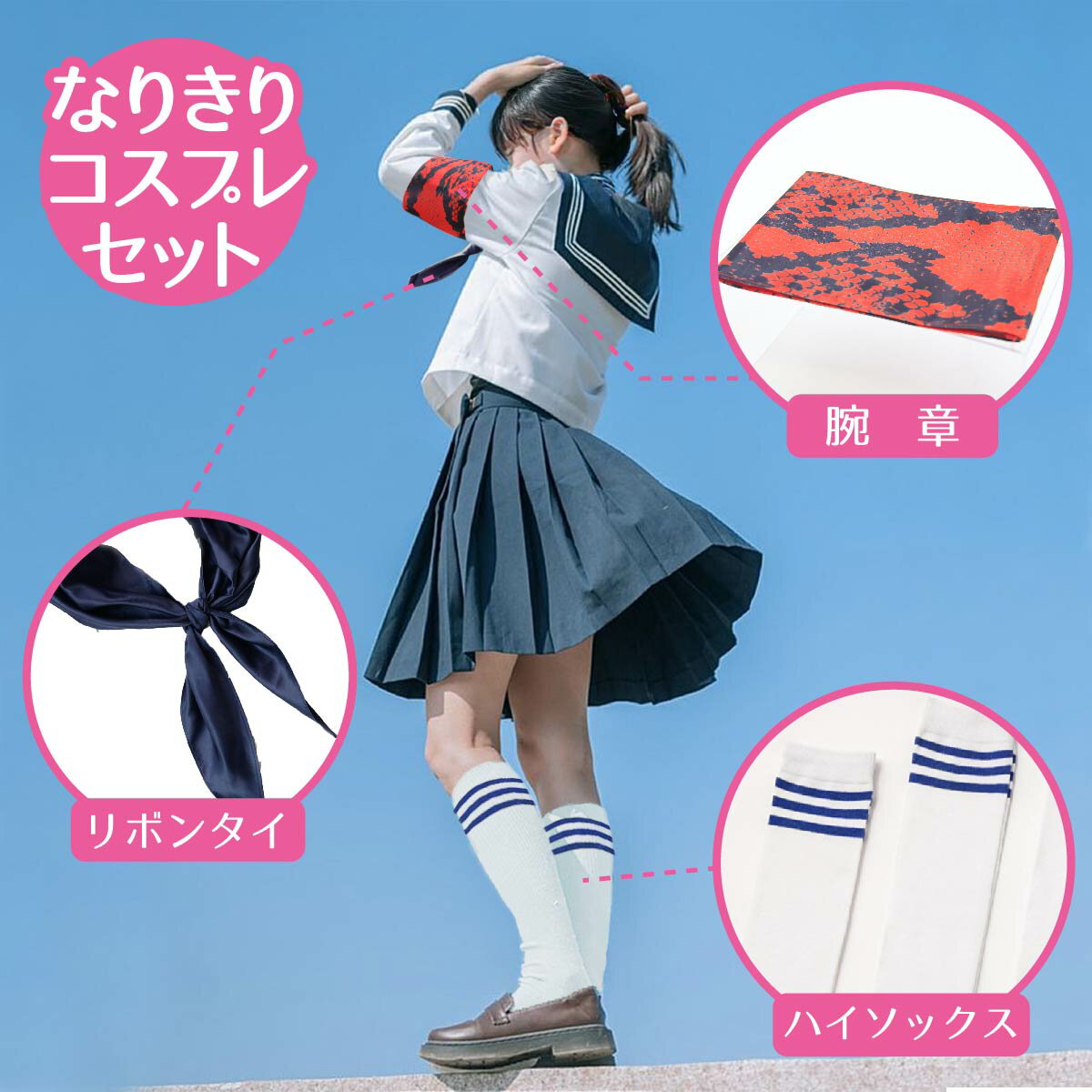 新しい学校に行くセーラー服なりきりコスプレ!ハロウィン コスプレ 衣装 仮装 おもしろ 女性 ハロウィンコスチューム 歌手 ものまね なりきり 新しい 学校 腕章 セーラー服 学生服 制服 三角タイ 女性グループ 余興 ダンス オトナ ハイソックス リボン ブルー 黒 リボンタイ ハロウィン コスプレ