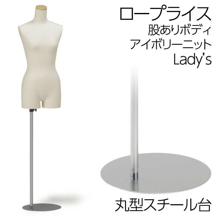 アイボリーニット張、股ありで、お手頃価格のレディースロープライスボディ。 軽量発泡素材で、移動に便利。ピン、針打ち可。腕なしタイプ。 股ありボディで、パンツスタイルにも対応。スタンドはベーシックなスチール丸ベース。店舗、展示会、ディスプレイ、洋服作りにも便利。※卓上タイプ(BWZ1-90)とセットでご使用になれます。(BWZ1-90はこちら)商品詳細 商品名 アイボリーニット張、レディースロープライス、ボディ、腕なし、股あり 商品こだわりポイント 型番 PF1-76 材質・仕様 ◎軽量発泡材/アイボリーニット張り ◎ヘッド:木調樹脂ヘッド ◎スタンドパイプ:アルミ/直径2.5センチ ◎スタンド(BB76):スチール丸ベース/マットクローム/直径30センチ ボディサイズ(cm) 9号 B W H 肩幅 ボディ丈 全体高さ 82 60 86 38 77 約116~165