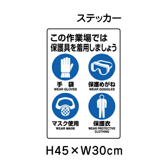 JIS規格 安全用品 日本語 英語 着用 使用 工場 案内看板▼ 作業場 保護具着用 手袋 保護めがね マスク 保護衣 JIS規格安全標識 2018年改正版 H45×W30cm / 標識 ステッカー シール un-802-712A