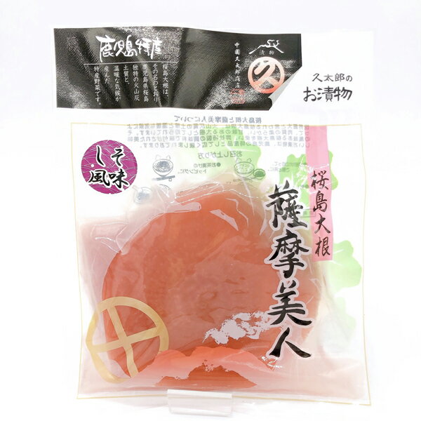 「桜島大根」の形と肉質を生かした程良い酸味の 「甘酢漬しそ味」です。中園久太郎商店薩摩美人(しそ味)