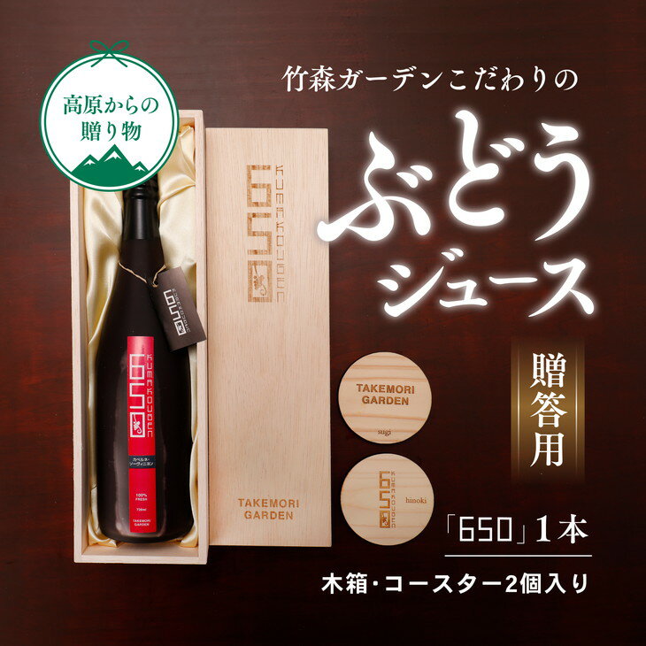 1本にぶどう1kg分!ワイナリー仕込みの贅沢なぶどうジュース【ふるさと納税】ぶどう ギフト ジュース「竹森ガーデンのぶどうジュース「650」」木箱入り1本セット コースター2枚入り | ブドウ 葡萄 ギフト プレゼント 贈り物 母の日 父の日 愛媛 久万高原町 ※2023年11月頃より順次発送予定 ※離島への配送不可