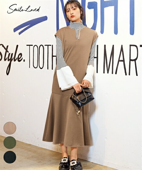 大きいサイズ レディース ぽっちゃりジャンパースカート 大きいサイズ レディース パール調ビーズ付きキーネック ジャンパー スカート ジャンスカ ワンピース カーキ/モカベージュ/黒 L~10L ニッセン nissen