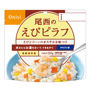 尾西の長期保存食シリーズ尾西の保存食シリーズは、用途に合わせた使い方でいつでもおいしく食べられる、保存食品です。登山に、旅行に、もしもの時に。いざという時、とても便利な保存食です。尾西のごはんシリーズ: エビピラフ バターとコンソメ味のご飯に、えび、人参の赤色、コーンの黄色、パセリの緑色が映え、 彩り鮮やかな「えびピラフ」です。 でき上がりの量は、市販のおにぎり(約100g)2.5個分ぐらいのご飯です。 ちょっと大盛り、260gのでき上がり量! ※3のところで調味粉末を入れ、よくかき混ぜてください。 内容量100g / 出来上がり量260g 5年保証: 常温保存が可能 賞味期限を大きく、見やすく表示してあります。原材料:うるち米(国産)、具(えび・コーン・人参)、食塩、乳糖、チキンエキスパウダー、野菜エキスパウダー、バター風味パウダー、酵母エキスパウダー、たん白加水分解物、パセリ、脱脂粉乳、香味油、粉末醤油、魚介エキスパウダー、ローレル、植物性油脂、トレハロース、調味料(アミノ酸等)、微粒酸化ケイ素、香料、甘味料(カンゾウ)、酸化防止剤(ビタミンE)、リン酸塩(Na)、酸味料、(原材料の一部に小麦、かに、ゼラチン、豚肉を含む)100gあたりの栄養成分表示エネルギー 361kcalたんぱく質 8.9g脂 質 1.8g炭水化物 77.3gナトリウム 1070mg [ 1袋あたり 内容量:約100g ]-----------------------------------------------------------------------------------------------アルファ米の『アルファ』とは、お米に含まれる「デンプンの状態」を示しています。お米は70~80%がデンプンでできています。生デンプン(生米)は、そのまま食べてもまずく、消化しにくいため栄養になりにくいのですが、水を含ませ熱を加えると、美味しくて、しかも消化しやすいデンプンに変わります。これを「アルファ化デンプン」といいます。 この「アルファ化デンプン」は、とても不安定なデンプンで、そのまま放置しておくと、また生デンプンへ戻っていきます。つき立ての“軟らかいおもち”がカチコチの“硬いおもち”に変わる、“炊き立てのご飯”が“ポロポロのご飯(冷や飯)” に変わるのは、「アルファ化デンプン」が生デンプンへ戻る現象なのです。 しかし、この生デンプンに再度、熱を加えると、再び「アルファ化」に変化し、軟らかいおもち、ふっくらとしたご飯に戻ります。この様に、デンプンとは非常に面白い特性を持つ物質なのです。アルファ米は、この面白いデンプンの特性を生かした食品です。 アルファ化したご飯は水分を除く(乾燥)と、生デンプンへ戻らず「アルファ化デンプン」の状態を保ち続けます。そして、このアルファ米にお湯や水を加えると、煮炊きせずとも、軟らかく美味しいご飯ができ上る、という訳です。-----------------------------------------------------------------------------------------------広告文責:株式会社ドラッグピュア(ky)神戸市北区鈴蘭台北町1丁目1-11-103TEL:0120-093-849製造元・販売元、または発売元:尾西食品株式会社〒108-0073 東京都港区三田3-4-2 COI聖坂ビル3階 (代表)TEL:03-3452-3212 FAX:03-3456-3783関連商品はこちら■保存食一覧■■尾西食品の保存食シリーズ一覧■