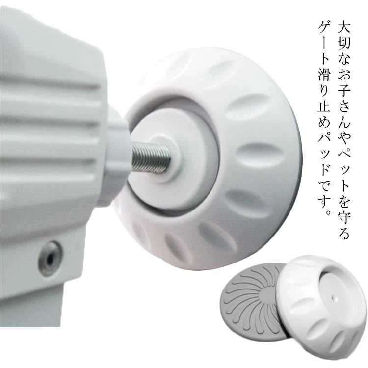 大切なお子さんやペットを守るゲート滑り止めパッドです。ベビーゲートやペットゲートの他、シャワーカーテン等の突っ張り棒の補強にもご利用いただけます。ポイント1:シリコン+ABS素材壁に優しく滑りにくい素材を採用、壁や柱を優しく守りますポイント2:接地面が大きいからズレにくい直径約8cmの大きな接地面積で固定力UP!ポイント3:壁や柱の傷汚れを防止圧力による壁や柱の傷や汚れを防止し、お家を綺麗に保ちますポイント4:工具不要で簡単取り付けドライバーやテープなどの取付工具は一切必要なし!ゲートの取り付けボルトをパッドの穴にはめ込むだけで取り付け完了ポイント5:その他の使い方シャワーカーテンや階段ゲート、突っ張り棒の補強等にも使用可能 サイズ4個セットサイズについての説明パッド外径:8cm パッド内径:4cm 高さ :2.5cm素材ABS ゴム色ホワイト備考 ●サイズ詳細等の測り方はスタッフ間で統一、徹底はしておりますが、実寸は商品によって若干の誤差(1cm~3cm )がある場合がございますので、予めご了承ください。●製造ロットにより、細部形状の違いや、同色でも色味に多少の誤差が生じます。●パッケージは改良のため予告なく仕様を変更する場合があります。▼商品の色は、撮影時の光や、お客様のモニターの色具合などにより、実際の商品と異なる場合がございます。あらかじめ、ご了承ください。▼生地の特性上、やや匂いが強く感じられるものもございます。数日のご使用や陰干しなどで気になる匂いはほとんど感じられなくなります。▼同じ商品でも生産時期により形やサイズ、カラーに多少の誤差が生じる場合もございます。▼