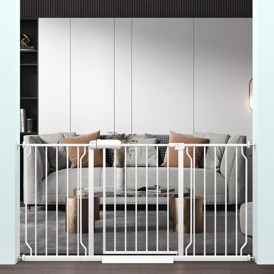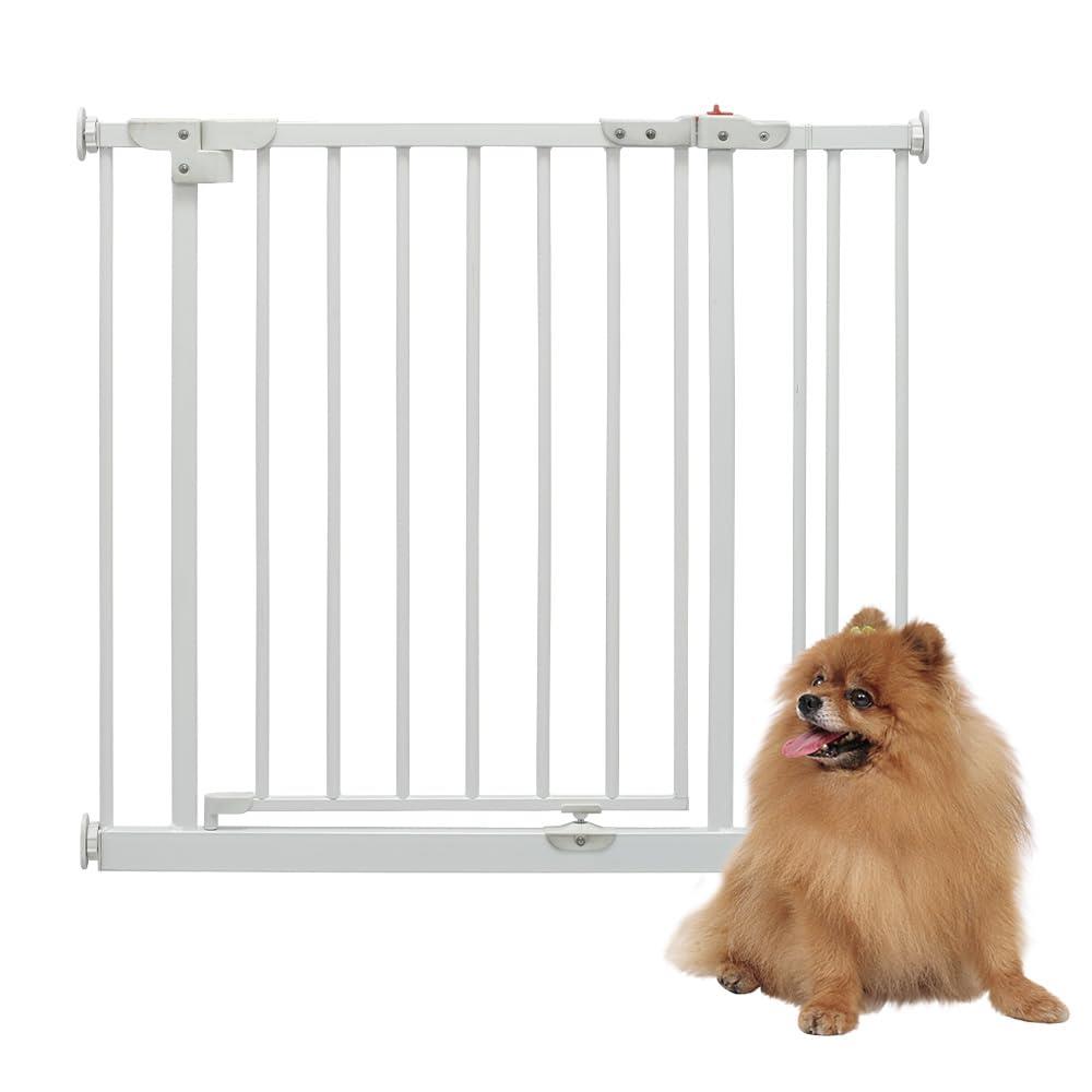 【ペットドア付き】ベビーゲートには猫と小型犬の出入りに便利な小さなドアが付いています。19*17.8cmのペットドアは小さなペットを通過させることができ、大きなペットを外に遮り。このベビーゲートの小さなペットドアが開く高さは調節して固定することができます。ロック機能を含む、ペットドア付き、ベビーゲートは赤ちゃんやペットがいる家庭に適しています。【ダブルロック】ペットゲートに上下のロックが連動して、ダブル になります。片手でボタンをスライドさせて同時に引き上げでロックが解除できます。ゲートは大人にとってすごく簡単に開けるように作ったが、赤ちゃんやペットにとって難しいロックです。【突っ張りタイプ】ベビーゲートは白黒2色から選択可能。穴け不要、簡単に設置できるつっぱり式ベビーゲート。壁に穴を開ける必要なく、アジャスターボルトで簡単に固定、壁にキッズなども残りません。【オートクローズ機能&前後両開き】90度未満の場合は、自動的に開閉できるオートロックタイプです。約90度開くと自動的に固定され、開いた状態をキープすることができます。 90度以上開いた場合のみ扉が開いたままにキープできます。この赤ちゃんゲートは180度のシャフトを採用しています。ドアは両方向に開閉でき、出入りがとてもラクラク。【注意事項】このベビーゲートは設置前ではドア部分が本体と引っかからず、閉まらない状態となっておりますが、初期不良ではございません。設置完了まで本体扉の部分の結束バンドを外さないでください。拡張フレームの組み合わせで最大幅215cmまで設置できます。説明 ベビーゲート高さ76cm。ペットドア付き、ドアは両側にロックすることができます。19*17.8cmのペットドア高さは調節可能、ネコちゃんと小型のワンちゃんが自由に出入りできます。 ご利用する場所によって、お選びすることができます。また、設置幅は61cmから最長は215cmまで設置できる超ロングゲートです。どんなに幅広くて、長い所でも、100cm以上や、150cm以上、170cm、180cm、210cmなど様々のサイズに合うように設置することができるロングゲートです。色はブラックとホワイトを二色と幅サイズを多くご用意しておりますので、お部屋に合う色とサイズを選ぶことができます。