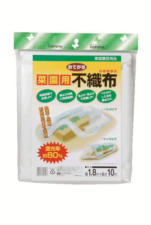 おてがるシリーズに不織布が仲間入り。べたがけ、トンネルに減農薬栽培をサポート!!鳥よけ、虫よけ、霜除けに。直接シートの上から水やりができます。おてがる菜園用不織布 1.8×10m