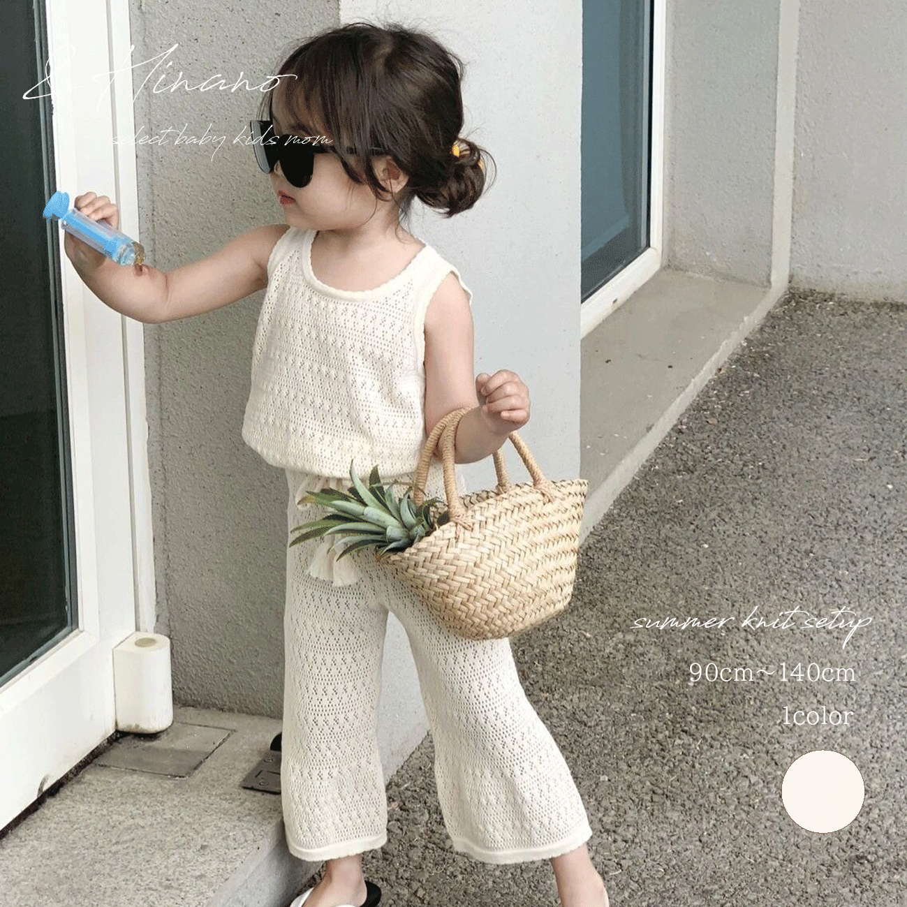 透け感とシルエットがとっても可愛いセットアップです。キッズ サマーニットセットアップ 韓国子供服 90cm~140cm 90 100 110 120 130 140 サマーニット 春 夏 秋 セットアップ ニットパンツ ノースリーブニット 女の子 上下セット 大人 かわいい 可愛い フレア ワイド パンツ 楽天ランキング入賞商品