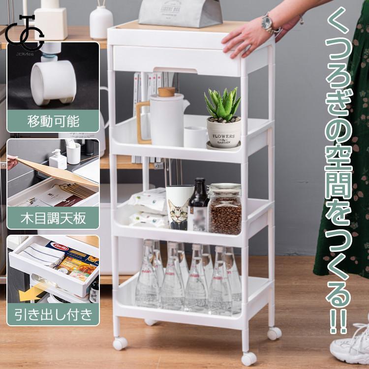 送料無料キッチンワゴン キャスター付き 木目調天板付き スリム 4段 引き出し付き サイドテーブル サイドワゴン 収納ラック 大容量 おしゃれ 寝室 洗面所