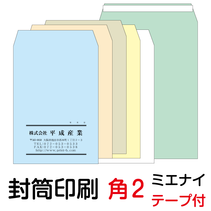 【封筒サイズ表】 ●レイアウト、印刷等は安心してお任せ下さい● ◎印刷はプロ向けのデジタルオンデマンド機(600dpi)を使用します。 (住所等の小さな文字まできれいに印刷できますのでご安心下さい) ◎刷り色は、スミ(黒)色で印刷されます。 ◎専門のスタッフが社名、店名、住所等バランスよくレイアウト致します。 ◎印刷前に原稿をメール送信致しますので、ご安心下さい。 ※校了(原稿内容でOK)のご連絡を頂いてから印刷・発送となります。 原稿確認後、必ずご返信をお願い致します。 ◎すべてオーダー品に付、受注後の変更・返品はできませんが、万一 印刷間違い等不備がございましたら、お手数ですがご連絡下さい。 早急に対応させて頂きます。 【ご注意とお願い】 ●WEB上の用紙の色はイメージ見本に付、実際とは多少異なります。 ※イメージした色や紙厚が違うといったクレームはご容赦願います。 ●印刷内容は、1種類とさせて頂きます。 【印刷内容について】 ●印刷する項目(社名、住所、TEL等)その他注意事項をご入力後、ご購入下さい。 ※入力欄が足りない場合は、ご購入後、備考欄にご入力下さい。 ●楽天ご登録アドレス宛に印刷原稿を送信致しますのでご確認後ご返信下さい。 ※楽天ご登録アドレス以外に送信ご希望の場合は、備考欄にアドレスをご入力下さい。 【キャンセルについて】 ●オーダー品につきましては、ご注文後お客様都合でのキャンセルの場合は 1種類につき税込1,320円のキャンセル料が発生致しますのでご注意下さい。●角2封筒とは● 寸法(240ミリ×332ミリ)の定形外封筒です。 (定型外封筒で一番よく使われている封筒で、A4書類が、折らずに入ります) (A4コピー用紙、約300枚入ります) ●事務用封筒はもちろん、小物の発送用としても使用できます● ●スミ以外の特色、ロゴ印刷、別デザインご希望の場合は別料金がかかります 必要に応じ、有料オプション(特色・ロゴ印刷・別デザイン)をご購入ください ●国産大手メーカー(ハート、山櫻、キングetc.) の製品を使用していますのでご安心ください。 角2封筒テープ付ミエナイカラー用紙(100)他の枚数のご注文はこちらから 100枚 200枚 300枚 400枚 500枚 1000枚 2000枚 3000枚 4000枚 5000枚 6000枚 7000枚 8000枚 9000枚 10000枚