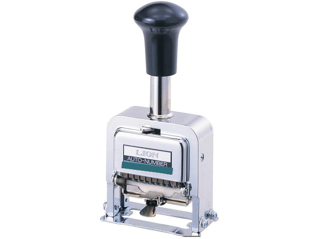 ダイキャストフレームにより、軽量化を図ったナンバリングです。ナンバリング B-76 206-11 B型 6桁7様式 E字体 字輪:真鍮彫刻 様式:0,1,2,3,4,6,12 全桁自動送り W70×D50×H140mm 付属品:メタルインキ1個・ステッキ1本 ライオン事務器 LION AUTO-NUMBER