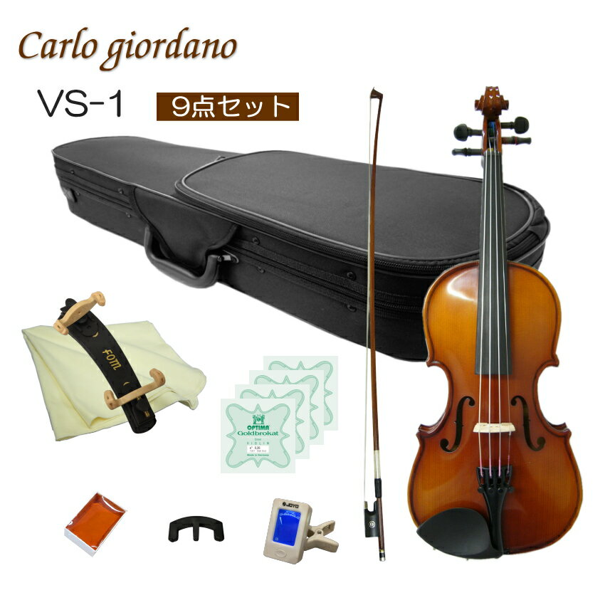 Carlo giordano Violin VS-1 当店では初心者向けの機種を中心に年間1000セット以上のバイオリンを販売いたしておりますが、過去最も販売量の多い機種が、こちらカルロジョルダーノのVS-1および本体が同じVS-F1です。 当店でご購入頂いている多くの方が、バイオリン教室に通っておられお子様の成長に合わせてサイズアップで再度お求め頂く例が多く、全国の多くのお教室でも採用されている機種です。 もっとお値段が高い機種と比較致しますと、同一機種であっても仕上げにおいて個体差は大きいですし、ペグの止まり具合も異なりますが、楽器として一定の品質以上が保たれていて、おすすめの機種です。 シンプルなセットから豪華独学セットまでご用意いたしております。お好みのセットをお選びください。 サイズアップで既に肩当てや松脂など共有でご使用いただけるものをお持ちの場合には、シンプルな「3点セット」がおすすめです。 また、ご要望に応じてセットを組ませていただくことも可能です。お気軽にお問い合わせください。 ■国内メーカーの中国生産のバイオリンについて 国内で初心者向けの楽器として流通している代表的なメーカーおよびブランドは、マックコーポレーション(カルロジョルダーノ/Carlo giordano)、キョーリツコーポレーション(ハルシュタット/Hallstatt)、キクタニミュージック(ステンター/STENTOR)、弦楽器メーカーのサクラ(グラツィオーソ/GRAZIOSO)などがございます。 当店ではすべてのブランドの取り扱いがございますが、おすすめ機種を主にご案内いたしております。 ■保証およびメンテナンス メーカー保証は1年間。弦や弓などの消耗部分以外で、通常のご使用時に故障が起きた際には、技術料はいただく事無くメーカーで修理や調整を行います。 また、定期点検などをご希望の場合は、当店でも点検(メンテナンス)および調整を行います。ので、ご不明な点などございましたら、まずは当店へお問い合わせください。 ※当店でメンテナンスをお引き受けする際はご購入から1年以内は送料のみご負担いただき、1年以上の場合は場合によって技術量が発生する可能性がございます。予めご了承ください。 ■ご注意ください バイオリンには7種類のサイズがございます。背丈によって適当なサイズをお選びいただくこととなります。 背丈とサイズの対比表を画像でご案内致しておりますが、ご不明な場合は、ご注文いただく前にお問い合わせください。 サイズ間違いによる商品の交換は、送料などの費用が別途必要となります。また、到着して日数が経過している場合は交換に応じられませんので、ご注意ください。 また、VS-1の弦は通常ナイロン弦が張られていますが、1/10サイズと1/16サイズはスチール弦になります。予めご了承ください。 ■仕様 表板 スプルース 裏板&側板 、ネック メイプル 指版 エボニー 糸巻き エボニー テールピース メタル製4アジャスタータイプ当店一番人気の初心者向けバイオリン「VS-1」 当店では初心者向けの機種を中心に年間1000セット以上のバイオリンを販売いたしておりますが、過去最も販売量の多い機種が、こちらカルロジョルダーノのVS-1および本体が同じVS-F1です。 当店でご購入頂いている多くの方が、バイオリン教室に通っておられお子様の成長に合わせてサイズアップで再度お求め頂く例が多く、全国の多くのお教室でも採用されている機種です。 もっとお値段が高い機種と比較致しますと、同一機種であっても仕上げにおいて個体差は大きいですし、ペグの止まり具合も異なりますが、楽器として一定の品質以上が保たれていて、おすすめの機種です。 シンプルなセットから豪華独学セットまでご用意いたしております。お好みのセットをお選びください。 サイズアップで既に肩当てや松脂など共有でご使用いただけるものをお持ちの場合には、シンプルな「3点セット」がおすすめです。 また、ご要望に応じてセットを組ませていただくことも可能です。お気軽にお問い合わせください。 ■国内メーカーの中国生産のバイオリンについて 国内で初心者向けの楽器として流通している代表的なメーカーおよびブランドは、マックコーポレーション(カルロジョルダーノ/Carlo giordano)、キョーリツコーポレーション(ハルシュタット/Hallstatt)、キクタニミュージック(ステンター/STENTOR)、弦楽器メーカーのサクラ(グラツィオーソ/GRAZIOSO)などがございます。 当店ではすべてのブランドの取り扱いがございますが、おすすめ機種を主にご案内いたしております。 ■保証およびメンテナンス メーカー保証は1年間。弦や弓などの消耗部分以外で、通常のご使用時に故障が起きた際には、技術料はいただく事無くメーカーで修理や調整を行います。 また、定期点検などをご希望の場合は、当店でも点検(メンテナンス)および調整を行います。ので、ご不明な点などございましたら、まずは当店へお問い合わせください。 ※当店でメンテナンスをお引き受けする際はご購入か