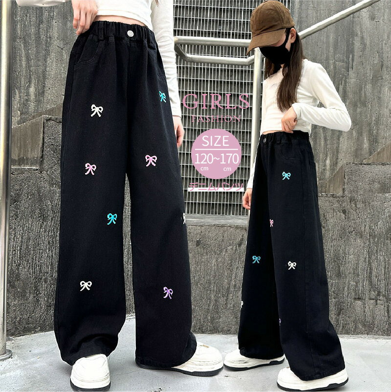 子どもの可愛らしさを引き立ててくれます!女の子 デニムパンツ ロングパンツ 長ズボン かわいい 蝶結び 春物 秋物 小学生 中学生 キッズ服 ロング丈 ジーンズ パンツ ズボン 子供服 ジュニア ブラック 120 130 140 150 160 170 cm