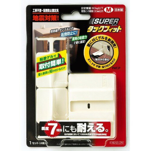 詳細説明ネジ、クギ不要で貼り付けるだけ。【特長】・対象物(家具や家電等)を動かすことなく簡単に取り付けできます。・粘着部は振動吸収効果の高いゲル材を使用しています。・粘着部は自己粘着性で剥がした後ののり残りがありません。・食器棚/タンス/小型家具用等に最適!目安重量(約):60kg以下壁面との隙間:30mm以内【使用方法】設置場所や設置する対象物に付いたホコリ・ゴミ・水・油などを取り除いてください。(1)アームをベースのガイドに沿って下方向にスライドし、ベース(壁面)の取り付け位置を決めてください。(2)ベースの剥離紙を剥がし設置場所に確実に貼付けてください。(3)アームをガイドに沿って上方向にスライドして剥離しを剥がした後、下まで降ろし、対象物を強く押しつけて固定してください。【剥がし方】(1)対象物を手前にずらして、ゆっくり傾けてください。(2)アームをゆっくり上方向に持ち上げて対象物からはずしてください。(3)アームを持って、ベースを下方向にテープを剥がすようにゆっくり傾けて壁面から剥がして下さい。 強引に剥がしますと壁または本製品が破損する可能性がありますのでご注意下さい。※ 剥がす場合は大人2名以上で作業してください。商品仕様(スペック)カラー:[本体]ホワイト [粘着部]ブラック本体サイズ(約):[ベース]7×5cm [アーム]4×3.5cmパッケージサイズ(約):幅14×奥2.8×高20cm 入り数:1セット(2個入り)素材:[本体]ABS樹脂 [粘着部]スチレン系ポリマー原産国:日本 注意事項・壁材によっては使用できない場合があります。・紙製、布製の壁紙(ビニールクロスは使用できます。)、土壁、珪藻土等の 壁材には使用できません。ネジ・クギなしで背の高い家具や什器を上から支え地震による転倒を防止します。
