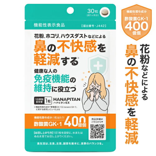 花粉 ホコリ ハウスダスト 対策 鼻の不快感が気になる方にお酢由来 酢酸菌 腸活 菌活 酢酸菌サプリ 免疫ケア サプリ 不快感軽減で年中スッキリ快適に 酢酸菌GK1【vl】花粉 ホコリ ハウスダスト などによる 鼻の不快感を軽減 花粉対策 サプリ 免疫 機能の維持 酢酸菌 サプリ GK-1 400億 酢 菌活 機能性表示食品 サプリメント 腸活 医師監修 国産 春花粉 秋花粉 スギ花粉 鼻グズ ハナピタンEX 30粒 約1ヶ月分【メール便】