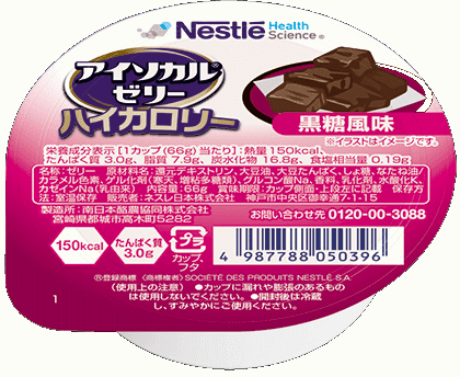 ネスレ日本株式会社 アイソカルゼリー ハイカロリー 医療機関で最も使用されている(※ネスレ調べ2014)カップジェリー アイソカルゼリー ハイカロリー 飲み込みやすいジェリータイプで手軽にカロリーアップ。 150 kcal/66gと少量高カロリー。 熱量: 150kcal/66g 少量高カロリー たんぱく質 3g配合 おかず等にもアレンジできるユニークな10の味わい とうふ味、スイートポテト味、あずき味、チョコレート味、黒糖風味、きなこ味、コーヒー味、レアチーズケーキ味、りんご味、もも味 ◎必要に応じて医師・栄養士にご相談ください。 ◎乳、大豆由来の成分が含まれています。 アイソカルゼリー ハイカロリーが支持される6つの理由!! 1)嚥下(えんげ)調整食分類2013コード1jに相当。 日本摂食嚥下リハビリテーション学会 嚥下調整食分類2013(抜粋) 2)全粥食の代替補助食品として。 「アイソカルゼリー ハイカロリー」なら1カップ(66g)で、 全粥食200gと同程度の熱量、たんぱく質量。 ※お粥200g 142kcal たんぱく質2.2g 出展:日本食品標準成分表2015 3)リン・カリウム量に配慮。 水分量の少ない、ジェリータイプ ・カリウムは1カップ(66g)で20mg。(100kcalあたり13mg)の含有。 ・リンは1カップ(66g)で28mg。(100kcalあたり19mg)の含有。 4)アミノ酸スコア100。 食品に含まれるたんぱく質の必須アミノ酸含有量のバランスを示す値。 数値が高いほど栄養価が優れ、最大値は100。 5)常温でも保存が可能。 冷蔵庫で保管の必要がないのでより身近な場所で保管ができます。 6)切り分け不要+衛生的。 ・一人ひとりに切り分ける手間がありません。 ・お1人1カップ使用なので、余分なく残渣を少なくできます。 ・カップを一つ一つに外部消毒できます。 □主要原材料 コーヒー味 還元デキストリン、大豆油、大豆たんぱく、しょ糖、なたね油、カラメル色素/ 香料、ゲル化剤(寒天、増粘多糖類)、グルコン酸Na、乳化剤、水酸化K、カゼインNa(乳由来) □使用上の注意 ◎カップに漏れや膨張のあるものは使用しないでください。 ◎カップの底に成分の白い粉がみられることがありますが、品質に問題はありません。 ◎現在量の一部に乳、大豆を含みます。 □アイソカルゼリー ハイカロリーの3大栄養素エネルギー比 脂質がエネルギー比で47%、炭水化物45%、たんぱく質8% □包装及び賞味期限 ◎包装:66g×24個 ◎バラエティパック包装:66g×24個(8種の味×各3個 ) 賞味期限:製造日より12ヶ月 □取り扱いの注意 ◎開封後は冷蔵し、すみやかにご使用ください。 ◎室温保存(直射日光を避け、なるべく涼しいところで保管してください)。
