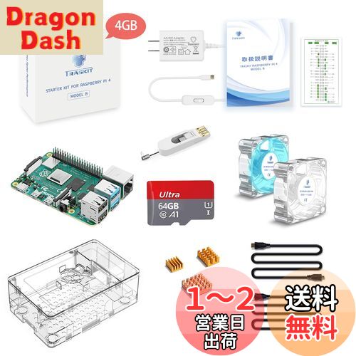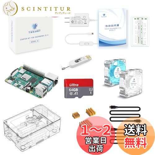 【送料無料】TRASKIT Raspberry Pi 4 Model B Starter Kit/ラズベリーパイ4B(4GB RAM)技適マーク付/MicroSDHCカード64GB NOOBSプリインストール/簡単に取り付けるケース/5.1V/3A Type-C スイッチ付電源/2つのMicroHDMI-to-HDMIケーブルライン/ヒートシンクと透明冷却フ
