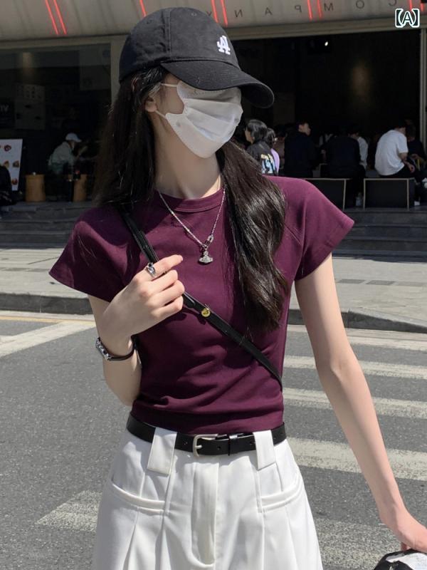 トップ ウエスト ショート ガール ホット スリムフィット 綿 202トップ ウエスト ショート ガール ホット スリムフィット 綿 2025夏 Tシャツ 半袖 パープル 女性用 レディース トップス