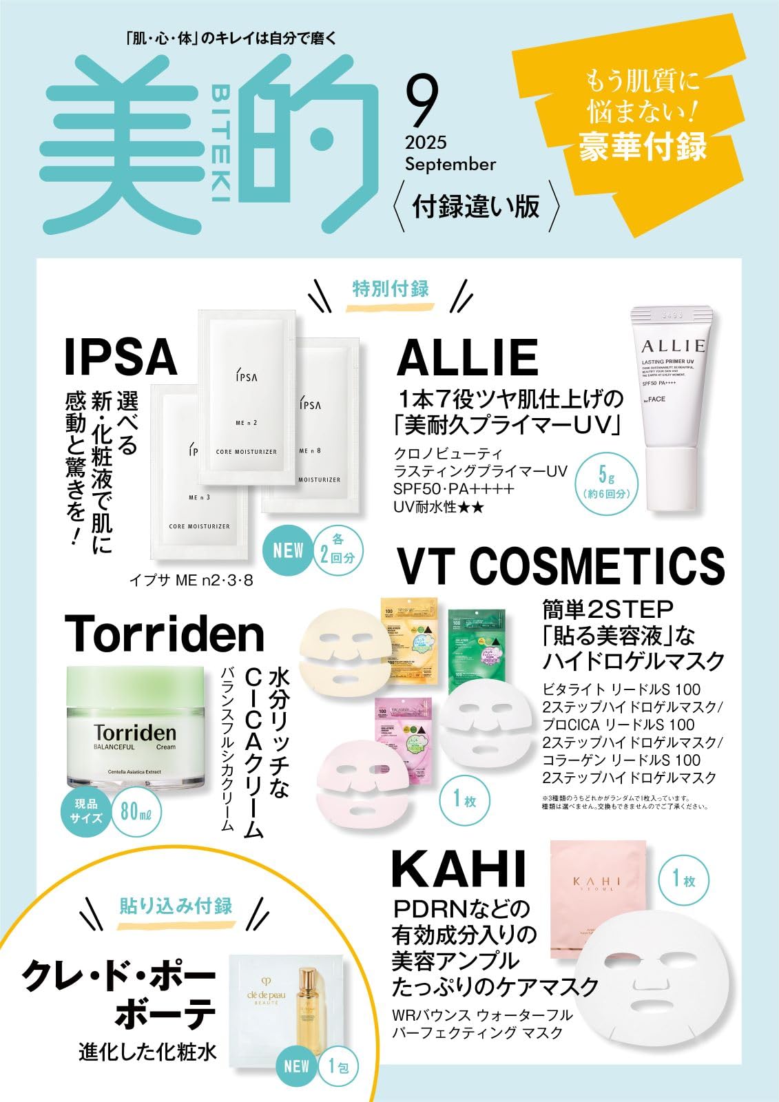 ※「美的9月号」の特別付録「タカミ スキンピール」「ILM アイライナー」「SABON フェイスボリッシャー リフレッシング」「melt 髪の「ストレスうねり」本質ケア」はつきません。〈特別付録〉肌もモチベもUP〓セットB●イプサ選べる新・化粧液で肌に感動と驚きを・イプサ MEn 2・3・8 各2回分●トリデンゆらぎ敏感肌のお守り〓 水分リッチなCICAクリーム 朝・晩の使用で約80日分!・トリデン バランスフル シカクリーム〈保湿クリーム〉80ml×1個●アリィー朝塗り立ての顔印象が長続き! 1本7役の優秀「美耐久プライマー」・クロノビューティ ラスティングプライマーUV〈日焼け止めジェル〉SPF50・PA UV耐水性★★5g×1本Read more※モニター発色の具合等により色合いが異なる場合がございます。