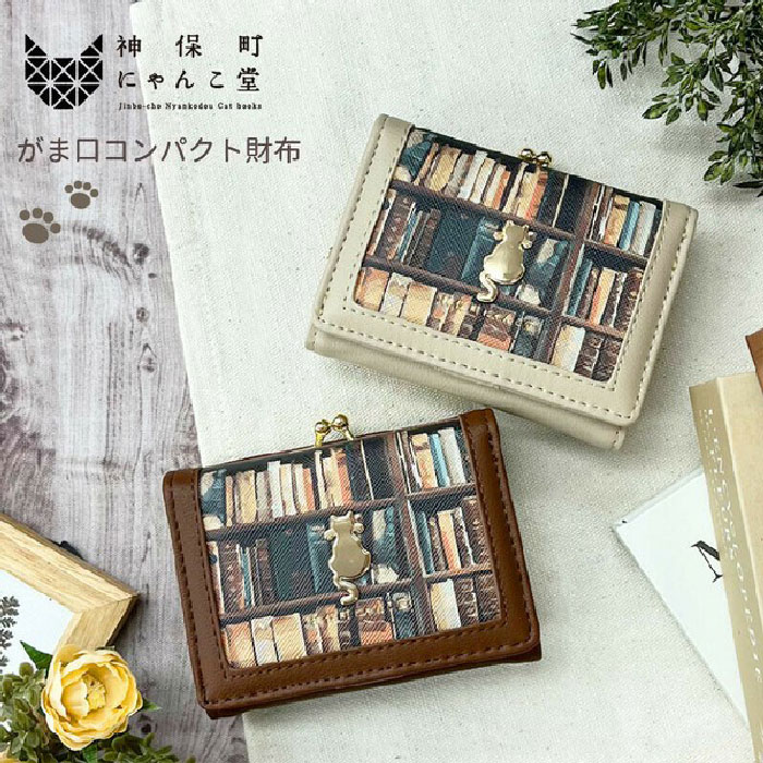 猫好きにはたまらない レトロな雰囲気神保町にゃんこ堂 BOOK柄 がま口コンパクト財布 3つ折り レディース 猫 ネコ キャット NDS-0012