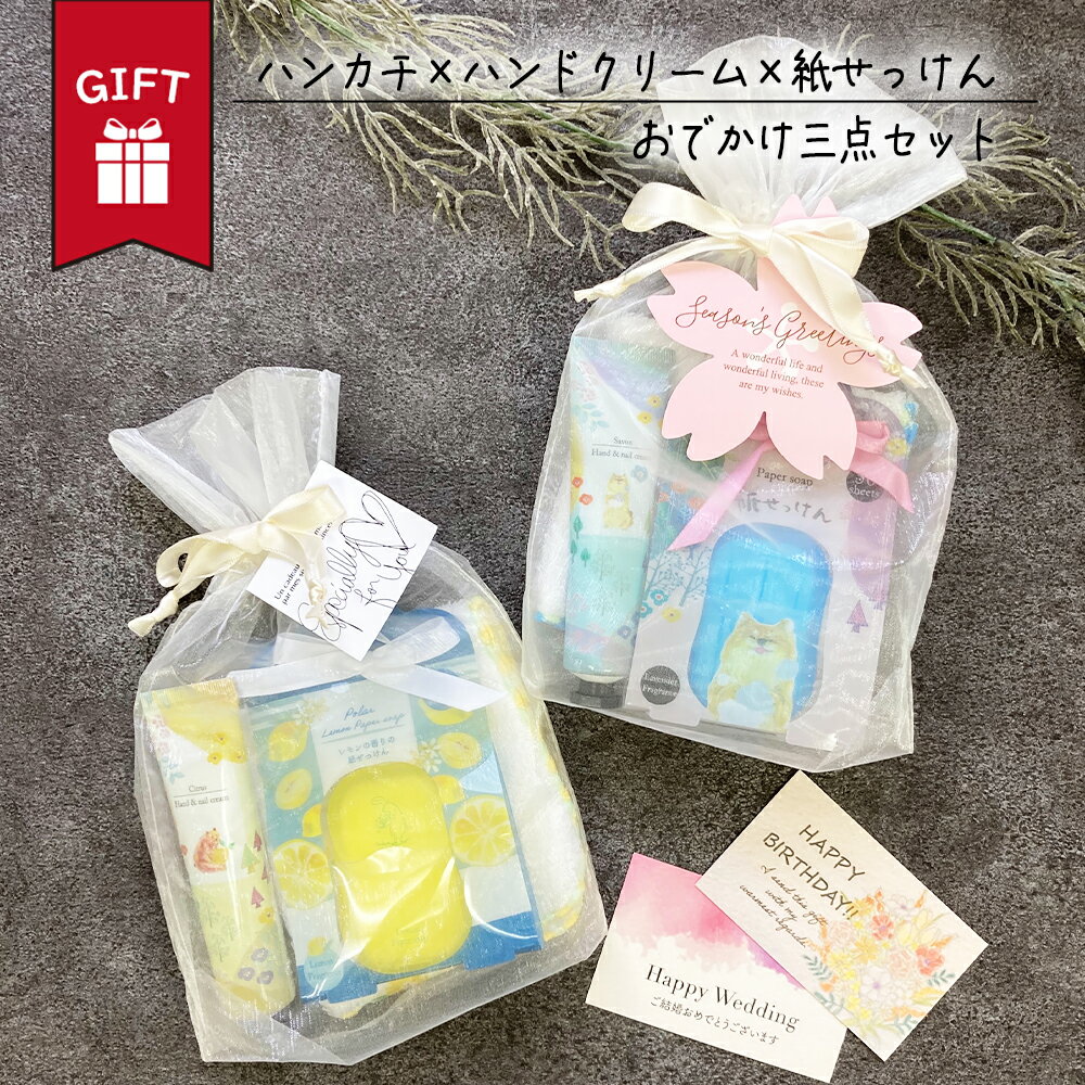 ハンカチとハンドクリーム、紙せっけんの三点入ったギフトセットです。ラッピング無料、プチギフトにもおすすめ。かわいい おしゃれギフト セット コットン ハンカチ ハンドクリーム 紙せっけん 花柄 ねこ プチ プレゼント ラッピング無料 サービス カード メッセージカード 付き 袋 お渡し袋 出産 祝い 誕生日 退職 祝い 父 義父 義母 女友達 男友達 彼氏 彼女 夫 妻 内祝い お中元