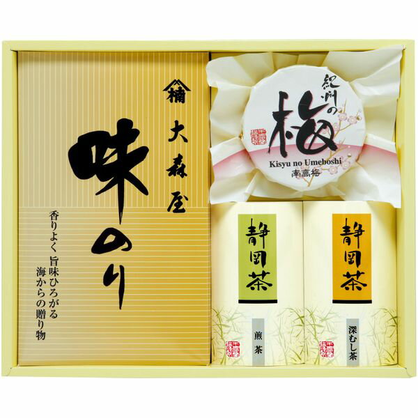 ●商品名/香味彩々 紀州南高梅 日本茶 NK-25●商品内容/大森屋味のり(8切8枚×2)、静岡煎茶40g、静岡深蒸し茶40g、紀州南高梅80g(塩分約8%)●箱サイズ/約25×30.5×5cm●重量/約470g●賞味期限/製造より360日●アレルゲン/小麦・えび・大豆・りんご●生産国/日本大森屋秘伝のピリ辛の味付けが食欲をそそる味付のり、本場紀州産南高梅の果肉たっぷりの最高グレードを使い塩分を従来よりカットしはちみつを加えた甘口で食べやすい梅干し、フリーズドライのたまごスープの詰め合わせギフトです※メーカー都合により、デザイン・内容等が変更になる場合がございます。