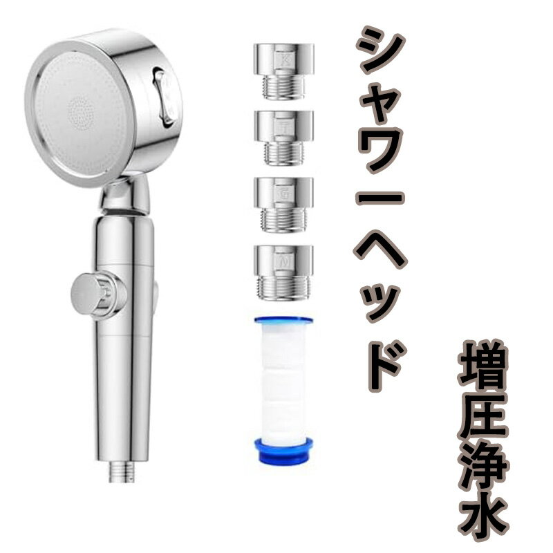 ?【2025年度最新・塩素除去機能付・浄水シャワー】強力な浄水機能を搭載した肌に優しいシャワーヘッドとなっています。亜硫酸カルシウム&活性炭&浄水カートリッジ付、シャワーヘッドの下部に取り付けるまたは、ホース根元にセットする浄水カートリツジで、 肉眼では見えないものや堆積物を取り除くだけで なく、水道水に残留された塩素を徹底的に除去できます。肌荒れや髪の毛の傷みを予防します。 肌への塩素刺激を抑えたやさしいシャワーへと進化しました。交換頻度は3 ~ 5カ月。具体的な判断は主に水質です。 N-NW-03 ?【増圧しゃわーへっど】こちらのしゃわーへっどは増圧効果で水圧が低くても快適な勢いで使用可能。頭皮と体洗浄に特化した新しい水流です。ご家庭で簡単に本格的なヘッドスパを体験できるしゃわーへっどです。細く勢いの強い水流が頭皮をしっかり「洗浄」し、皮膚微細な刺激を与えます。一日に疲れさを一瞬に落とす。また、お肌にやさしく、洗い流しに向いている極細の水流です。N-NW-03 ?【極細水流・節水機能】最新増強版のシャワーヘッドは散水板の穴の大きさ、配置、速度などを徹底的に研究して、3種類の吐水口が発見し、少ない水の量でも勢い良く、シルクのようにきめ細やかな浴び心地の両立を実現地よいバスタイムを楽しみながら、しっかりと節水することができます。品質にこだわったので弊社の当シャワーヘッドが「空気混合方式」を採用することで、同じ水圧でも水の使用量を大幅に節約します。搭載されている水量調節機能によって、最大約80%の節水が期待できます。N-NW-03 ?【3段階モード・角度自由調整】ジェット/全開/マッサージの3段階吐水モードがあり、極細ミスト水流のでファインバブルが発生、ファインバブル(マイナスイオンを帯電)が肌にあたると、汚れをイオン効果により吸着します。通常のシャワーより、落としきれない毛穴に詰まった皮脂汚れやメイク残り、余分な古い角質などの汚れを取り除きます。 ヘッドの角度を調整できる3D機能で、左右360°、上下60°に動かせるシャワーヘッド。N-NW-03 ?【取付簡単&セット内容】国際汎用基準G1/2インターフェース通用デザインで、ご家庭のほとんどのシャワーに取り付け可能です。工具不要なのでとっても簡単。初めてインストールする場合でも、そんな時間がかかりません。アダプター(K/M/G/T --4種類)で取り付けることができ、ほとんどのメーカーに対応可能です。※【パッケージ内容】シャワーヘッド本体×1台、静水カートリッジ×2本(シャワーヘッド本体に1つを装着済み)、接続用ゴムリング×5個、アダプター(K/M/G/T)--4種類。*部品の欠品や破損があった場合は、お買い求めの販売店にご連絡下さい。N-NW-03