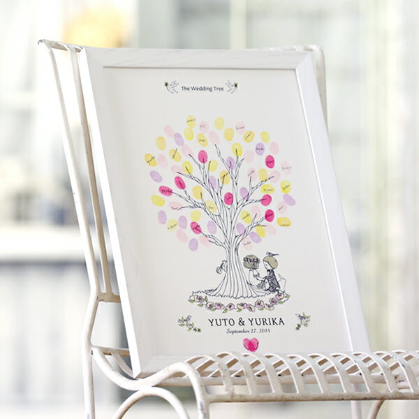little happiness (リトルハピネス) 木漏れ日のやわらかい光と輝く緑が美しい木の下で、世界でひとつだけの物語がはじまります。 幸せなふたりを祝福しようと、動物たちも集まってきました。 「恥じらい」「清浄」の花ことばを持つシャクヤクのティアラが、花嫁の可憐さをいっそう引き立てています。 ウェディングツリー(little happiness) 商品見本 ウェディングツリーのデザインのみのお届けとなります。 別売りでインクパッド・イラストフレームのご注文も承っております。 完成イメージ A3サイズ・64名で作成 A4サイズ・36名で作成 完成イメージでの使用インクパッドカラー: 01.02.03.04.05 【デザインについて】 ・お名前とご希望の日付(挙式日・結婚記念日等)を英語表記で印字いたします。 お名前は全て大文字のローマ字表記となります。 (ご注文時の名前入力欄へ小文字入力された場合も、実際の印字は全て大文字表記となります) スペル、日付をお間違えないようご入力ください。 ・フォントをお選び頂くことはできません。 ・こちらのデザインは幹部分におふたりのアルファベットは入りません。 【用紙サイズについて】 A4サイズ(横210mm×縦297mm) 適応:~50名程度 A3サイズ(横297mm×縦420mm) 適応:~100名程度 ※実際にゲストの方々に一つずつ指印を押してもらうと、広がりが出てシルエットが大きくなる傾向にあります。 ゲスト30名程度以上からはA3サイズをおすすめします。 ※A4サイズはA3サイズに比べ用紙が小さい分、木に対し指印が大きくなります。 ※ご希望の用紙サイズをご選択ください。A3、A4ともに価格は同一です。 ・ウェディングツリーのデザインのみのお届けとなります。 別売りでインクパッド・イラストフレームのご注文も承っております。 【用紙・印刷方法について】 ・0.26mmの厚みのある上質なマット用紙に印刷いたします。 (参考: コピー用紙:厚み0.08~0.09mm パンフレット:厚み0.17mm前後 官製はがき:厚み0.23mm) ・顔料インクで印刷いたします。 (顔料インクは耐水・耐久性に優れており、美しい仕上がりが特徴のインクです) ・商品は丸めず伸ばした状態で配送いたしますので、紙に跡がつく心配はございません。 【説明カードプレゼント】 ゲストの方々にウェディングツリーの完成イメージと作成方法を分かりやすく伝えるための説明カードをプレゼントしています。