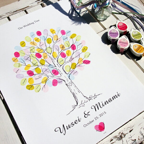 natural time (ナチュラルタイム) 木漏れ日の中で感じるふたりだけの心地よい空間。 そよ風に揺れる枝葉、小鳥たちのさえずりも聞こえてきます。 シンプル & ナチュラル、甘さを抑えたデザインです。 ウェディングツリー(natural time) 商品見本 ウェディングツリーのデザインのみのお届けとなります。 別売りでインクパッド・イラストフレームのご注文も承っております。 完成イメージ A3サイズ・65名で作成 A4サイズ・35名で作成 完成イメージでの使用インクパッドカラー: 07.08.09 【デザインについて】 ・お名前とご希望の日付(挙式日・結婚記念日等)を英語表記で印字いたします。 お名前は、1文字目のみ大文字、2文字目以降は小文字のローマ字表記となります。 スペル、日付をお間違えないようご入力ください。 ・フォントをお選び頂くことはできません。 ・ツリーの幹の部分には、お名前のアルファベット1文字目が入ります。 【用紙サイズについて】 A4サイズ(横210mm×縦297mm) 適応:~50名程度 A3サイズ(横297mm×縦420mm) 適応:~100名程度 ※実際にゲストの方々に一つずつ指印を押してもらうと、広がりが出てシルエットが大きくなる傾向にあります。 ゲスト30名程度以上からはA3サイズをおすすめします。 ※A4サイズはA3サイズに比べ用紙が小さい分、木に対し指印が大きくなります。 ※ご希望の用紙サイズをご選択ください。A3、A4ともに価格は同一です。 ・ウェディングツリーのデザインのみのお届けとなります。 別売りでインクパッド・イラストフレームのご注文も承っております。 【用紙・印刷方法について】 ・0.26mmの厚みのある上質なマット用紙に印刷いたします。 (参考: コピー用紙:厚み0.08~0.09mm パンフレット:厚み0.17mm前後 官製はがき:厚み0.23mm) ・顔料インクで印刷いたします。 (顔料インクは耐水・耐久性に優れており、美しい仕上がりが特徴のインクです) ・商品は丸めず伸ばした状態で配送いたしますので、紙に跡がつく心配はございません。 【説明カードプレゼント】 ゲストの方々にウェディングツリーの完成イメージと作成方法を分かりやすく伝えるための説明カードをプレゼントしています。