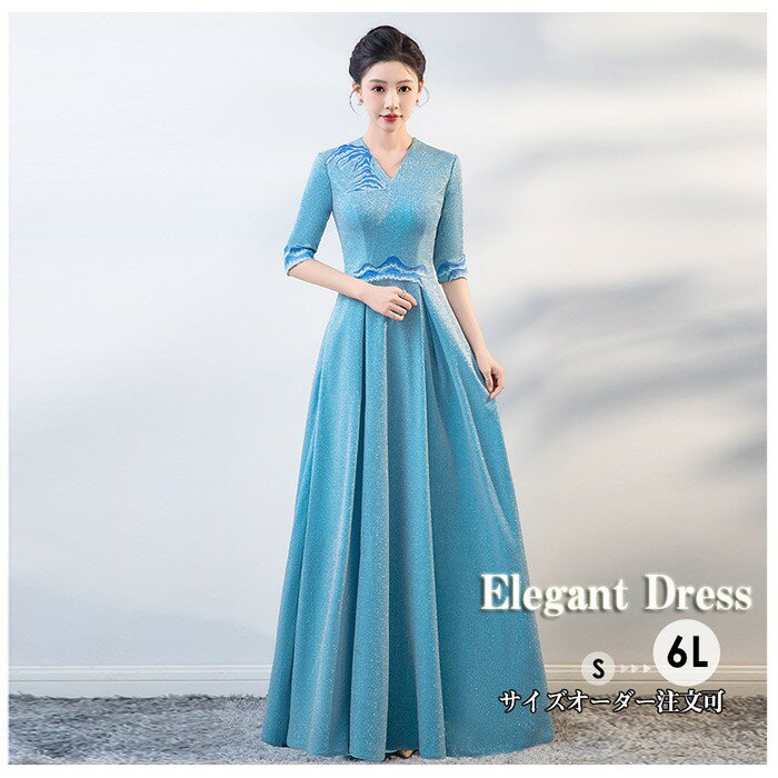 このエレガントなロングドレスは、発表会や結婚式に最適で、Vネックと5分袖が特徴です。ドレス 大人 ピアノ 発表会 パーティードレス エレガント ロングドレス Vネック 演奏会 ワンピース 成人式 同窓会 結婚式 母親 5分袖 袖あり パーティ 青 S M L 2L 3L 4L 5L 6L