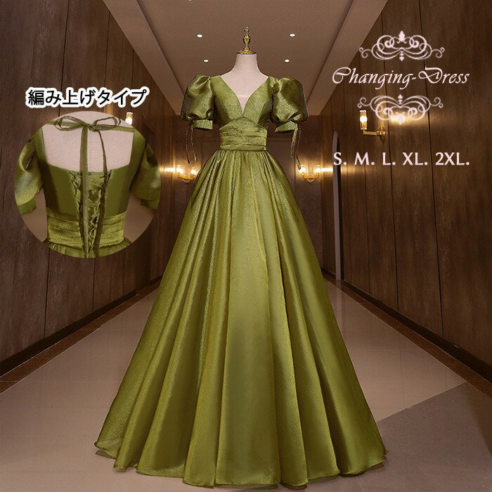 S-3L エレガントなブライズメイドドレスは、ピアノ発表会や結婚式などのフォーマルな場に最適。体型カバー効果も抜群です。カラードレス お色直し グリーン 緑 結婚式 ロングドレス 演奏会 袖あり ポワント袖付き パフスリーブ パーティードレス フォト婚 ピアノ発表会 イブニングドレス バックレスドレス 編み上げ プリンセスライン 透け感 イベント 演出 舞台 ステージ 衣装 S-2XL