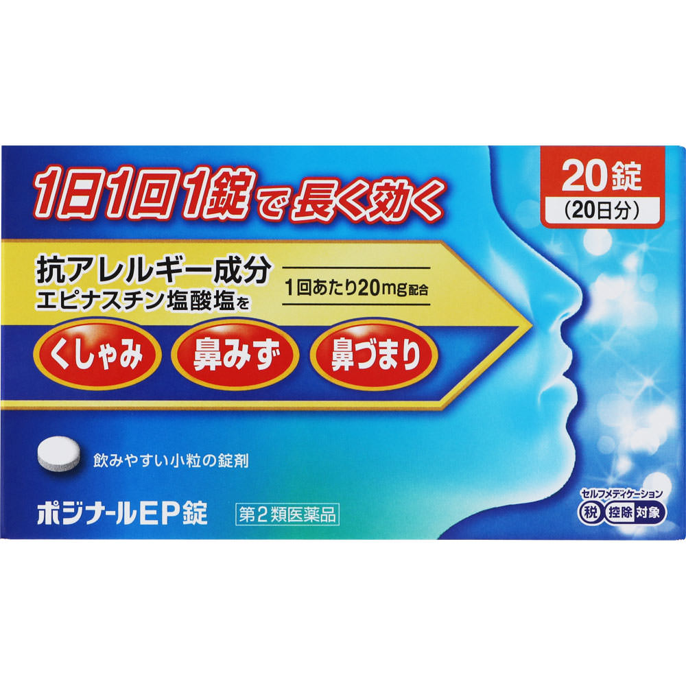 商品説明■ 特徴アレルギー用薬 (エピナスチン塩酸塩製剤) ◆ポジナールEP錠は、医療用成分エピナスチン塩酸塩を配合したお薬です。 ◆エピナスチン塩酸塩は、体内でアレルギー症状を引き起こす原因物質の放出を阻害する作用があり、くしゃみ、鼻みず、鼻づまりといった症状を改善します。 ◆1日1回就寝前の服用で作用を発揮します。■ 効能・効果花粉、ハウスダスト(室内塵)等による次のような鼻のアレルギー症状の緩和:くしゃみ、鼻みず、鼻づまり■ 内容成分・成分量本品1錠(1日量)中 成分・・・分量 エピナスチン塩酸塩・・・20mg 添加物:乳糖水和物、結晶セルロース、部分アルファー化デンプン、ヒドロキシプロピルセルロース、ステアリン酸マグネシウム、ヒプロメロース、マクロゴール6000、酸化チタン■ 用法・用量/使用方法<用法・用量> 次の量を1日1回、就寝前に水又はぬるま湯で服用してください。 年齢・・・1回量 成人(15才以上)・・・1錠 15才未満・・・服用しない■ ■メール便発送の商品です■ こちらの商品はメール便で発送いたします。下記の内容をご確認下さい。 ・郵便受けへの投函にてお届けとなります。 ・代引きでのお届けはできません。 ・代金引換決済でご注文の場合はキャンセルとさせて頂きます。 ・配達日時の指定ができません。 ・紛失や破損時の補償はありません。 ・ご注文数が多い場合など、通常便でのお届けとなることがあります。 ご了承の上、ご注文下さい。 ■ 【広告文責】 会社名:株式会社ウィーズ TEL:048-501-7440 区分:日本製・第2類医薬品 メーカー:ノーエチ薬品[医薬品・医薬部外品][鼻炎薬][第2類医薬品][JAN: 4975687016216]【第2類医薬品】ポジナールEP錠 20錠※セルフメディケーション税制対象 【6個セット】 【メール便】 (4975687016216-6) <エピナスチン塩酸塩>を配合した、くしゃみ、鼻水、鼻づまりに効果を現すアレルギー専用鼻炎薬。 1日1回1錠、就寝前の服用で、効き目が1日続く。空腹時にも服用できます。