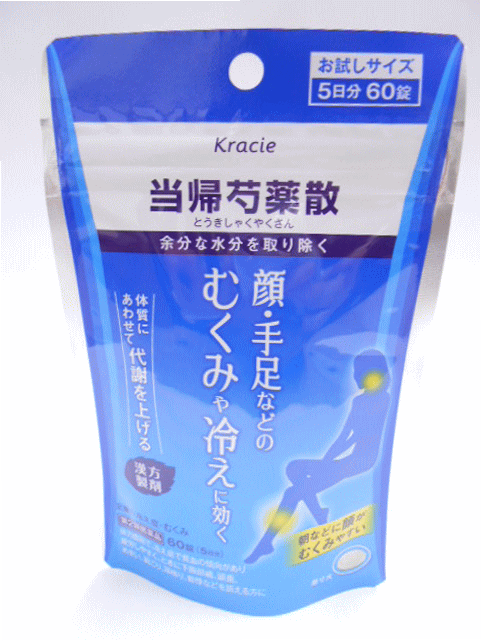お買い上げいただける個数は1個までです 一般用医薬品 : クラシエ当帰芍薬散錠 医薬品情報 製品名 クラシエ当帰芍薬散錠 製造販売元 クラシエ製薬(株) 販売会社 クラシエ薬品(株) 医薬品分類 一般用医薬品 小分類 当帰芍薬散 一般用医薬品分類 リスク区分 第2類医薬品 リスク区分 包装 60錠 288錠 成分 (12錠(4800mg)中) トウキ末 409mg センキュウ末 409mg シャクヤク末 546mg ブクリョウ末 546mg ソウジュツ末 546mg タクシャ末 546mg 添加物 ヒドロキシプロピルセルロース ケイ酸アルミニウム ステアリン酸マグネシウム セルロース 色 淡褐 本文情報 効果・効能 体力虚弱で,冷え症で貧血の傾向があり疲労しやすく,ときに下腹部痛,頭重,めまい,肩こり,耳鳴り,動悸などを訴えるものの次の諸症:月経不順,月経異常,月経痛,更年期障害,産前産後あるいは流産による障害(貧血,疲労倦怠,めまい,むくみ),めまい・立ちくらみ,頭重,肩こり,腰痛,足腰の冷え症,しもやけ,むくみ,しみ,耳鳴り 特徴 ●「当帰芍薬散」は,漢方の古典といわれる中国の医書「金匱要略」の婦人妊娠病,婦人雑病に収載されている薬方です。 ●貧血ぎみの方の足腰の冷えや肩こり・むくみなどに効果があります。 使用上の注意 ■相談すること 1.次の人は服用前に医師,薬剤師又は登録販売者に相談してください (1)医師の治療を受けている人 (2)胃腸の弱い人 (3)今までに薬などにより発疹・発赤,かゆみ等を起こしたことがある人 2.服用後,次の症状があらわれた場合は副作用の可能性があるので,直ちに服用を中止し,この文書を持って医師,薬剤師又は登録販売者に相談してください [関係部位:症状] 皮膚:発疹・発赤,かゆみ 消化器:食欲不振,胃部不快感 3.1ヵ月位服用しても症状がよくならない場合は服用を中止し,この文書を持って医師,薬剤師又は登録販売者に相談してください 用法・用量 1回15才以上4錠,14~7才3錠,6~5才2錠,1日3回食前又は食間 5才未満は服用しない 用法に関する注意 小児に服用させる場合には,保護者の指導監督のもとに服用させてください。 保管及び取り扱いに関する注意 (1)直射日光の当たらない湿気の少ない涼しい所に保管してください。 (ビン包装の場合は,密栓して保管してください。なお,ビンの中の詰物は,輸送中に錠剤が破損するのを防ぐためのものです。開栓後は不要となりますのですててください。) (2)小児の手の届かない所に保管してください。 (3)他の容器に入れ替えないでください。(誤用の原因になったり品質が変わります。) (4)使用期限のすぎた商品は服用しないでください。 (5)水分が錠剤につきますと,変色または色むらを生じることがありますので,誤って水滴を落としたり,ぬれた手で触れないでください。 (6)4錠分包の場合,1包を分割した残りを服用する時は,袋の口を折り返して保管してください。なお,2日をすぎた場合には服用しないでください。 その他 ■健康アドバイス ●体を冷やさない 寒い冬に冷たいものを食べたりする食生活は冷えの原因になります。野菜を煮たり炒めたりした温野菜をとり,体の中から血行を良くするようにしましょう。 ●体は適度に動かしましょう 新陳代謝を高めるために大切なのは,体を動かすことです。ただし,運動の目的はあくまでも健康維持です。体に無理のない,マイペースでできる運動をしましょう。 会社情報 問い合わせ先 クラシエ薬品株式会社 お客様相談窓口 (03)5446-3334 10:00~17:00(土,日,祝日を除く) 販売元住所等 クラシエ薬品株式会社 〒108-8080 東京都港区海岸3-20-20 製造販売元住所等 クラシエ製薬株式会社 〒108-8080 東京都港区海岸3-20-20 ●副作用被害救済制度のお問い合わせ先 (独)医薬品医療機器総合機構 電話0120-149-931(フリーダイヤル) 文責:有限会社ミカワ薬局 薬剤師:川辺隆子 広告文責 (有)ミカワ薬局 06-6673-1055 E-Mail:info@mikawaph.com メーカー クラシエ薬品株式会社 製造国 日本 区分 第2類医薬品 使用期限:使用期限まで半年以上あるものをお送りします 医薬品販売に関する記載事項