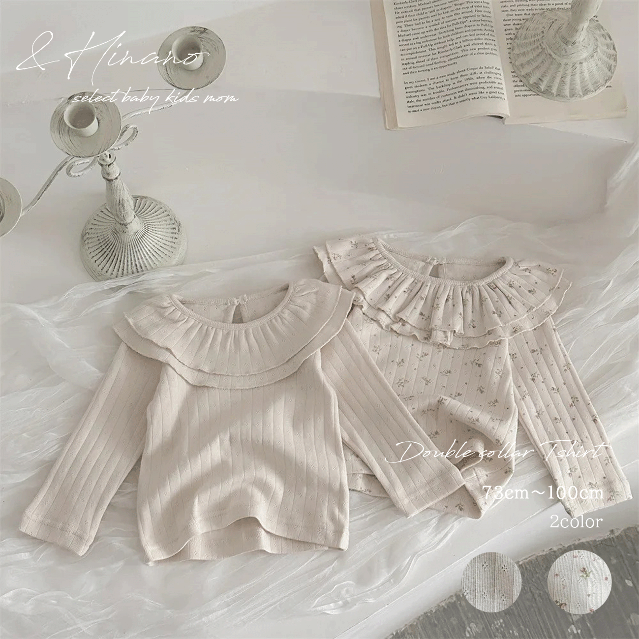 ナチュラルな生地感がかわいい2種類の長袖カットソーですベビー キッズ 女の子 ダブルカラー長袖Tシャツ 73cm~100cm 70 80 90 100 韓国子供服 ナチュラル 花柄 フローラル フラワー ビックカラー ビッグカラー トップス 襟付き 長袖 2重襟 赤ちゃん 春 秋 冬
