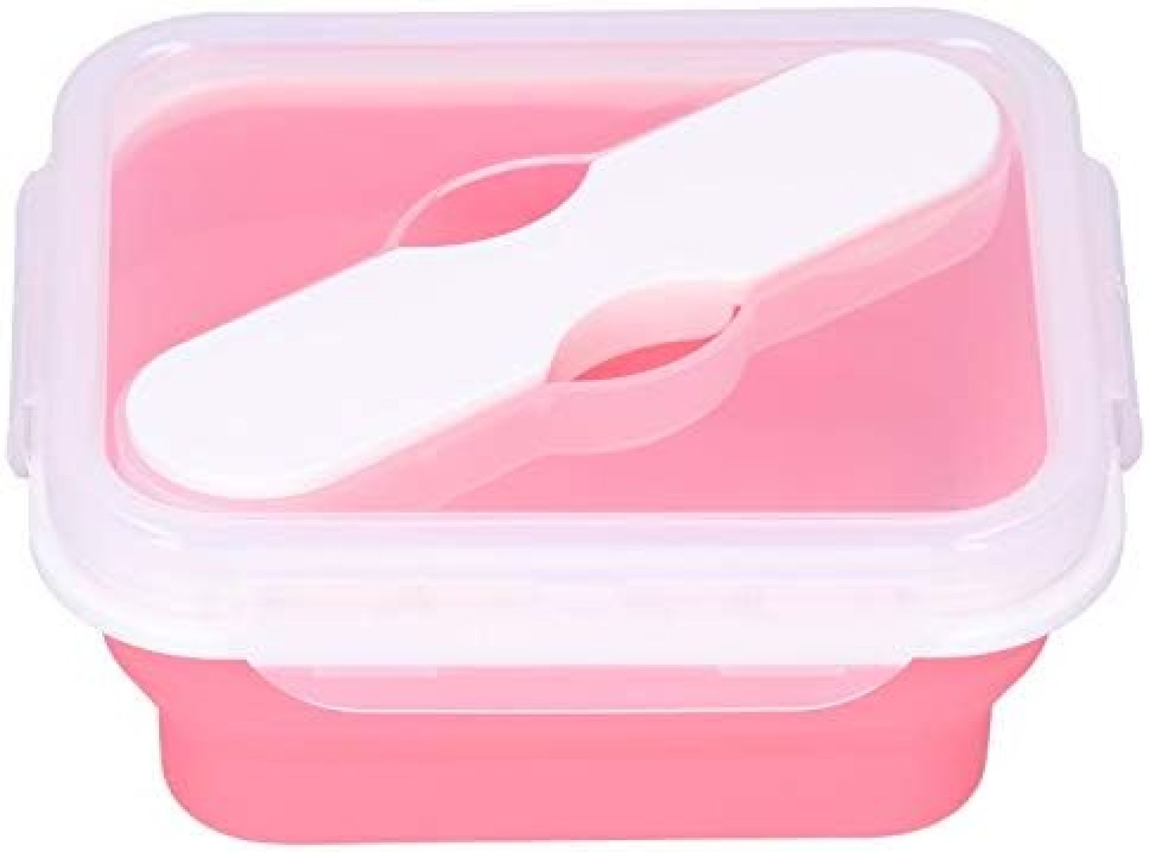 シリコンランチボックス、ふた付き折りたたみ式食品収納容器、フォークスプーン一体型、キッチン、電子レンジ、食器洗い機、冷凍庫用のポータブルシリコン折りたたみ式お弁当箱(ピンク)