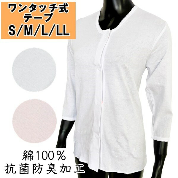 カラーワンタッチ式テープで掛け違い防止!婦人 レディース 介護肌着 おもいやり肌着 ワンタッチ式テープ 7分袖 前開きシャツ S M L LL 綿100% 抗菌防臭加工【1点までゆうパケット可能】