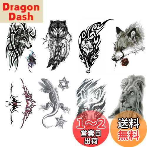 商品情報商品の説明主な仕様 【セット内容】タトゥーシール トライバル 狼 8枚セット、8種類、各1枚。【サイズ】:約15cm×21cm(絵柄台紙部分)。br【 含まれるもの】トライバル 狼(オオカミ)赤 薔薇 羽、トライバル ハート、トライバル ハート、トライバル トカゲ 、ライオン 。br【持ち時間】防水加工のため、お風呂など通常は4-7日程度保つ事が出来ます。 手足等のよく動かす所と間接部分は1,2日程度が目安です。br【材質】:ポリエステル 高品質の紙 、裏面:EVA樹脂 接着剤。br【貼るだけ簡単】 腕や足、体や背中等、お好きな場所に。