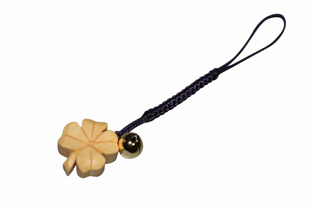 本黄楊根付けストラップ-No.202宝来鈴付き・四つ葉のクローバー日本製品全長約10センチ大願成就 家内安全 千客万来 商売繁盛 開運 雑貨 和風雑貨 開店祝い プレゼント ギフト【キモノ仙臺屋の和雑貨特集】