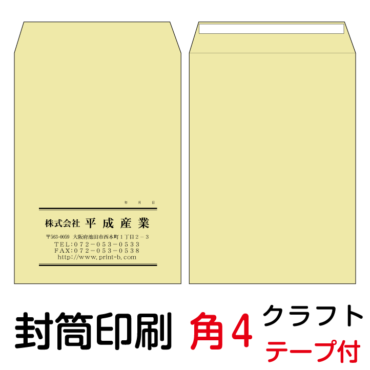 【封筒サイズ表】 【レイアウト、印刷等は安心してお任せ下さい】 ●印刷はプロ向けのデジタルオンデマンド機(600dpi)を使用します。 (住所等の小さな文字まできれいに印刷できますのでご安心下さい) ●刷り色は、スミ(黒)色で印刷されます。 ●専門のスタッフが社名、店名、住所等バランスよくレイアウト 致しますので当方にお任せ下さい。 ●印刷原稿をメール送信致しますので、ご確認後お知らせ下さい。 ●すべてオーダー品に付、受注後の変更、返品はできませんが万一 印刷間違い等不備がございましたら お手数ですがご連絡下さい。 早急に対応させて頂きます。 【ご注意とお願い】 ●WEB上の用紙の色はイメージ見本に付、実際とは多少異なります。 ●イメージした色や紙厚が違うといったクレームはご容赦願います。 ●印刷内容は、1種類とさせて頂きます。 【印刷内容について】 ●印刷する項目(社名、住所、TEL等)その他注意事項、ご要望があれば 買い物かごに入れた後、注文ページステップ3の備考欄へ記入願います。 ●送付先と同じ印刷内容でも記載がない項目は印刷されませんので ご注意願います。 ●印刷原稿を送付致しますので、備考欄へメールの送信先を記載して下さい。 【キャンセルについて】 オーダー品につきましては、ご注文後お客様都合でのキャンセルの場合は 1種類につき税込1,320円のキャンセル料が発生致しますのでご注意下さい。●角4封筒とは… ●寸法(197ミリ×267ミリ)の定形外封筒です。 ●事務用封筒はもちろん、小ロットの発送用として使用できるので、非常に便利です。 ●B5書類が、折らずに入ります ●スミ以外の特色、ロゴ印刷、別デザインご希望の場合は別料金がかかります 必要に応じ、有料オプション(特色・ロゴ印刷・別デザイン)をご購入ください ●国産大手メーカー(ハート、山櫻、キングetc.) の製品を使用していますのでご安心ください。 角4封筒テープ付クラフト用紙(85)他の枚数のご注文はこちらから ↓ご希望の枚数をクリックしてください↓ 500枚 1000枚 2000枚 3000枚 4000枚 5000枚 6000枚 7000枚 8000枚 9000枚 10000枚