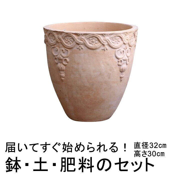 ◆植物があればすぐに寄せ植えが作れます◆ 初心者 おしゃれ 植木鉢 土 肥料 セット テラコッタ鉢おしゃれ 土・肥料のセット 植木鉢 訳あり 模様入り 丸深型HM白粉 素焼き鉢 テラコッタ 鉢 大 32cm 12リットルと培養土と鉢底石と鉢底ネットと肥料のセット