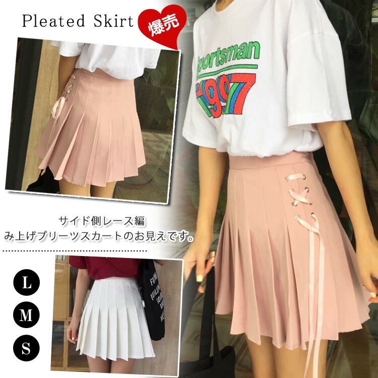 サイド レースアップ ヘム プリーツ ミニ丈 スカート 女性 レディース ボトム ショート丈 春 夏 秋 ハイウエスト 腰高 台形 脚長効果 スタイルアップ 細見え プリーツ リボン 編み上げ 可愛い キュート 無地 カジュアル ガーリー