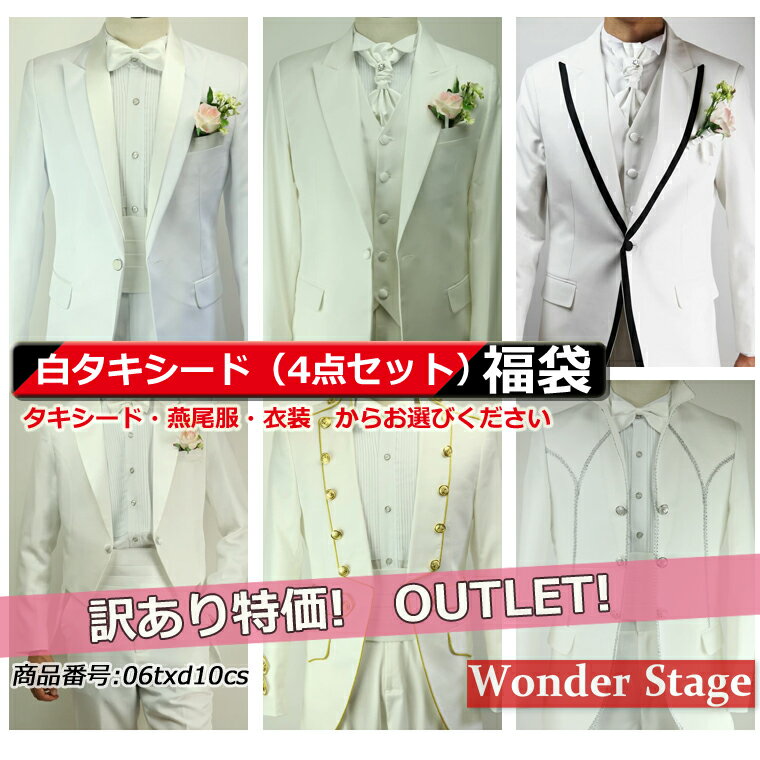 汚れやキズのある商品です。ホワイトタキシードタイプ、燕尾服タイプ、衣装タイプ、3種類のタイプからお選びください。特別価格で提供、どのデザインが届くかお楽しみ!【60%OFF】ホワイト タキシード福袋 タキシードタイプ 燕尾服タイプ 衣装タイプ ジャケット パンツ カマーバンド 蝶ネクタイ 4点セット またはジャケット パンツ ベスト アスコットタイ 4点セット 訳あり商品 捨てない取組み 特別価格 3種類タイプ サイズS~5L 06txd10cs
