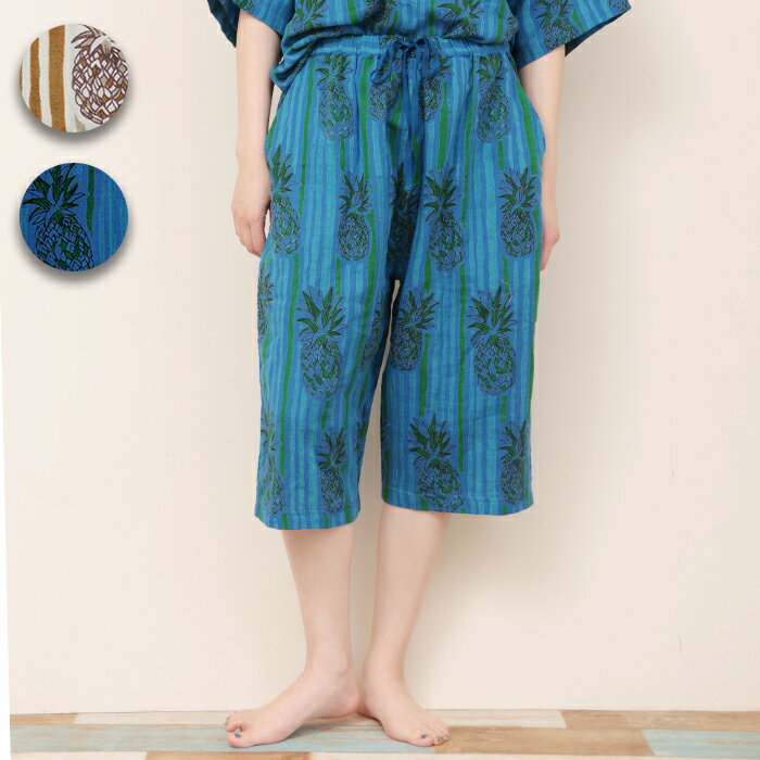 おうちでのリラックスタイムに♪肌触りの良いルームシャツプリントガーゼルームパンツ / ハーフパンツ パジャマ ルームウェア 部屋着 ワンマイルウェア ウエストゴム 男女兼用 春 夏 インド綿 ガーゼ コットン 可愛い ゆったり 柄 パイナップル ブロックプリント風 ベージュ ブルー おうち時間 エスニック チチカカ TITICACA