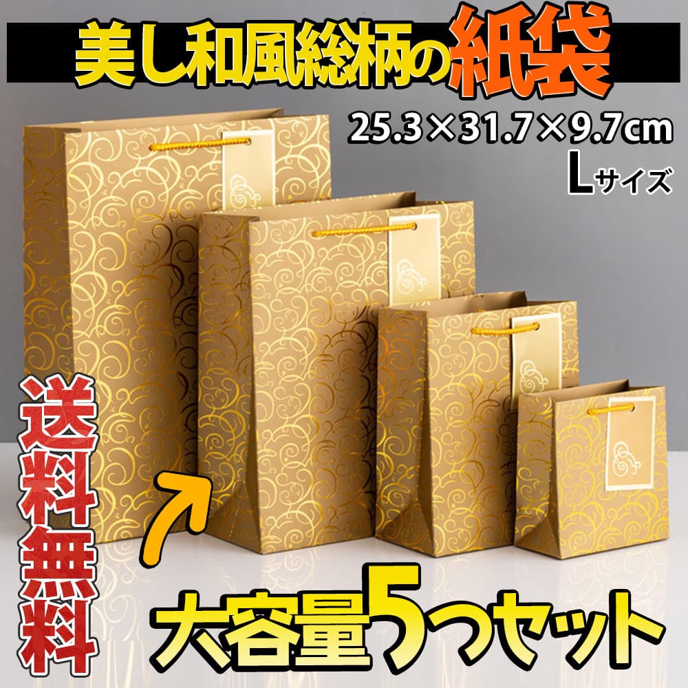 送料無料 ギフト ラッピング プレゼントボックス ギフト梱包 ギフトバッグ ギフト包装 包装 箱 ラッピング 資材 ラッピングキット セット キット プレゼント 贈り物 ギ最短当日出荷◆ラッピング ギフトバッグ 手提げ袋 紙袋 5枚 (ゴールド 和風×タグ 25.3×31.7×9.7cm) ゴージャス 豪華 金 総柄 パターン ジャパン 和 おしゃれ