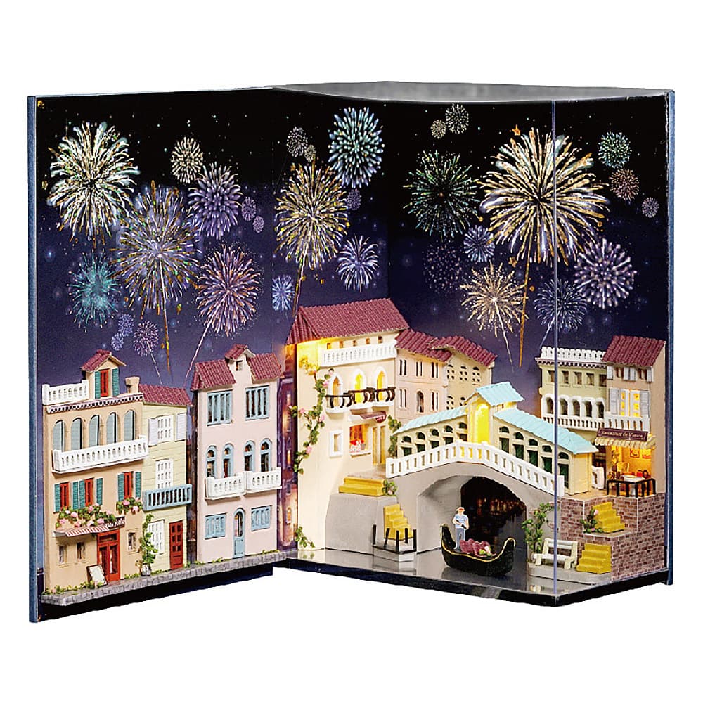 ドールハウス ミニチュア キット DIY 木製 家具 花 フラワー DIY おもちゃ 子供 模型 手芸 ハンドメイド 手づくり 建物 ドール キット 手作り ライト 光る最短当日出荷◆ドールハウス ミニチュア 手作りキットセット 本の中の小さな町 花火咲く水上の都 | 小型 初心者向け | 本型 ブック | LEDライト付属
