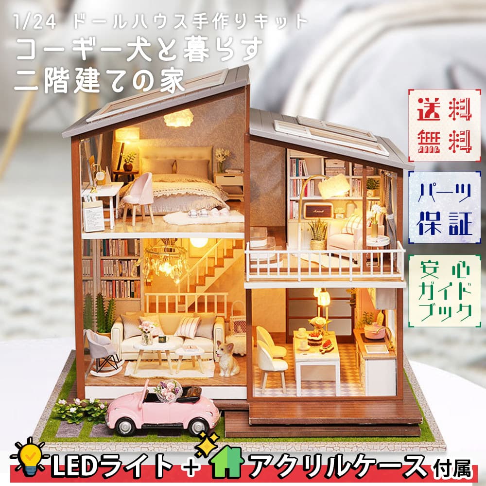 送料無料 ドールハウス ミニチュア キット DIY 木製 家具 1/24 アクリルケース DIY おもちゃ 子供 模型 手芸 ハンドメイド 手づくり 建物 ドール キット最短当日出荷◆1/24 ドールハウス ミニチュア 手作りキットセット コーギー 犬 と暮らす 二階建ての家 ナチュラル サボテン ピンク 車 カー シャンデリア | LEDライト+アクリルケース