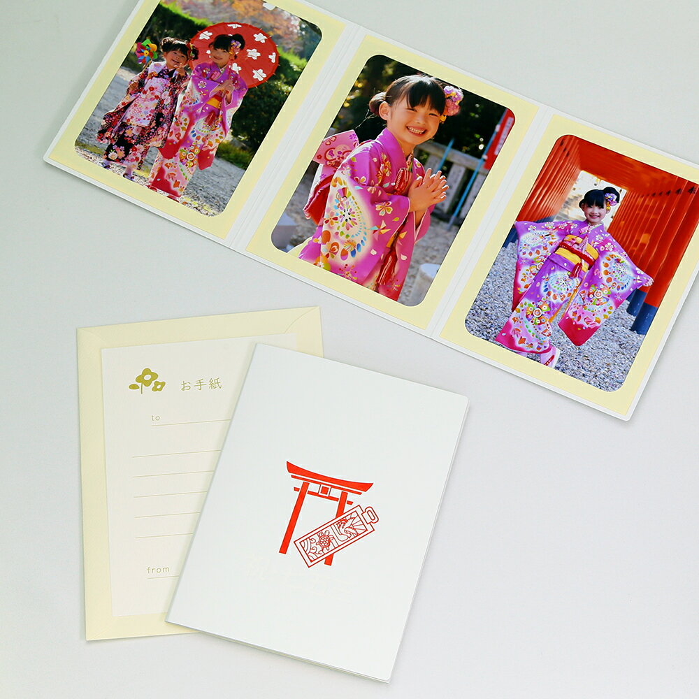 【基本仕様】 2Lサイズ収納、3ツ折3面(タテ・タテ・タテ) 【材質】 表紙:紙(タント紙/100kg両面合紙) ポケット:紙(タント紙/100kg) メッセージカード:紙(マーメイド紙/115kg)) 封筒:紙(ボス紙/110kg) 【台紙厚さ】 (折りたたみ時)7mm 【表紙厚さ】 0.8mm 【ポケット中抜き】 ビク抜き 【表紙外寸法】 145×190mm 【ポケット外寸法】 132×182mm 【ポケット中抜き寸法】 112×162mm 【重量】 約65g 【付属品】 メッセージカード1枚、封筒1枚 封筒サイズ(210×160mm) ※こちらの商品は、2Lサイズ(127×178mm))写真用になります。Lサイズ(89×127mm)にはご利用いただけません。 表紙に『祝・七五三』の文字と『鳥居と千歳飴』の絵柄を箔押した七五三写真台紙。 七五三の記念写真を入れて、贈ったり保存したりに最適な写真台紙です。 写真はポケット部分に差し込むだけで、かんたんです。 見開きの状態。そのまま立てて飾ることもできます。 付属のメッセージカードは、ポケットに差し込める大きさになっています。写真を両面に3枚収納ですが、このように写真の横にメッセージカードを添える使い方もできます。 (付属品:1)メッセージカード (付属品:2)封筒 ※ご注意:モニターの発色の具合によって実際のものと色が異なる場合がございます。表紙に『祝・七五三』の文字と『鳥居と千歳飴』の絵柄を箔押した七五三写真台紙。 七五三の記念写真を入れて、贈ったり保存したりに最適な写真台紙です。 写真はポケット部分に差し込むだけで、かんたんです。 見開きの状態。そのまま立てて飾ることもできます。 付属のメッセージカードは、ポケットに差し込める大きさになっています。写真を両面に3枚収納ですが、このように写真の横にメッセージカードを添える使い方もできます。 (付属品:1)メッセージカード (付属品:2)封筒 ※ご注意:モニターの発色の具合によって実際のものと色が異なる場合がございます。